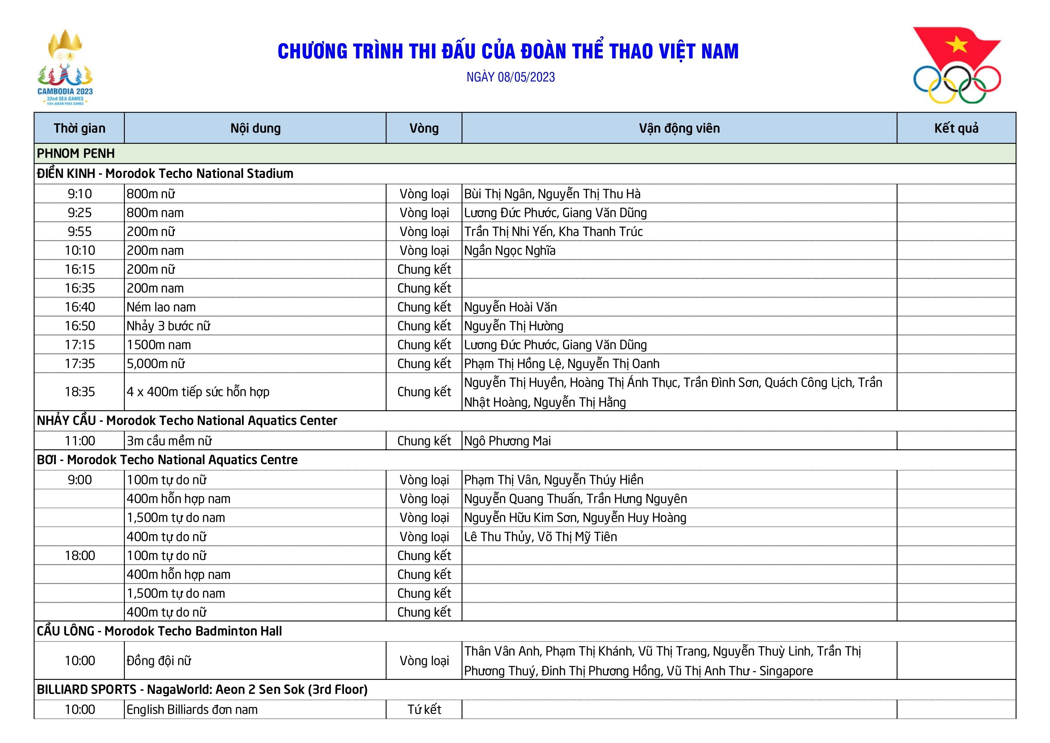 Tâm điểm của ngày thi đấu 8/4 là màn tranh tài của các VĐV tuyển điền kinh Việt Nam. Trong buổi sáng các VĐV thi đấu vòng loại thì buổi chiều và tối có 7 nội dung chung kết.