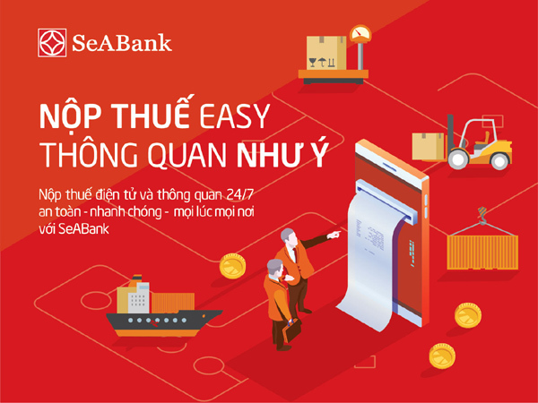 Nhằm tăng cường cải cách thủ tục hành chính, giảm thời gian thông quan, giảm thời gian nộp thuế, tạo thuận lợi cho người nộp thuế..., SeABank triển khai dịch vụ nộp thuế điện tử và thông quan 24/7. Theo đó, khách hàng có thể chủ động nộp thuế xuất nhập khẩu vào mọi lúc, mọi nơi, mọi phương tiện miễn có kết nối internet, không bị phụ thuộc vào thời gian làm việc của cơ quan thu thuế (Ngân hàng, Kho bạc Nhà nước, Tổng cục Hải quan).