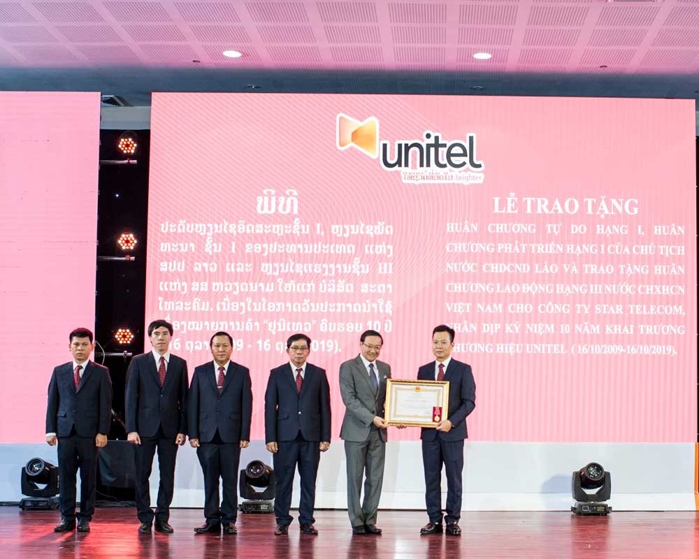Thay mặt Chính phủ nước Cộng hòa Dân chủ Nhân dân Lào, ngài Phó Thủ tướng Sonexay Syphandone đã trao tặng Unitel Huân chương Tự do Hạng Nhất, Huân chương Phát triển Hạng Nhất . |