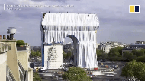 Du khách đến Pháp ngỡ ngàng khi nhìn thấy đài tưởng niệm Khải Hoàn Môn (Arc de Triomphe) tại Paris đang được bọc kín bởi 25.000 mét vuông vải polypropylene tái chế.