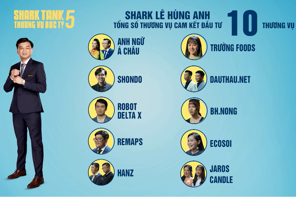 Theo thông tin mới được công bố, Shark Tank mùa 5 đã kết thúc với tổng cộng 31 thương vụ hợp tác trên sóng. Trong đó, Shark Hùng Anh - thành viên mới của “bể cá mập” trở thành nhà đầu tư bạo chi nhất mùa 5 với 10 thương vụ.