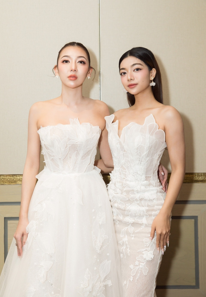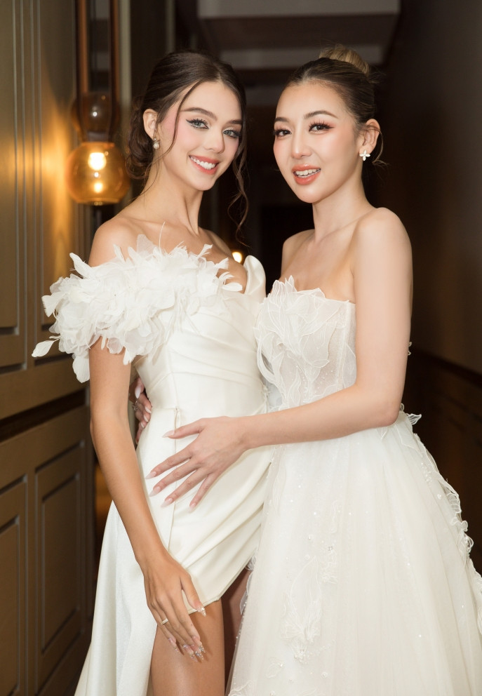 Cả hai diện 2 mẫu váy cưới trắng cách điệu được thiết kế kỳ công với phom dáng ôm, xẻ ngực và tôn đường cong cơ thể. Sherri Phan được giao trang phục với họa tiết cổ điển, đính ren và đá nhẹ tạo hiệu ứng thẩm mỹ đẹp mắt. Trong khi đó, Vera Nguyễn hóa cô dâu hiện đại với váy cắt xẻ, xếp ly ở phần đầu và thân váy đính kết lông vũ.