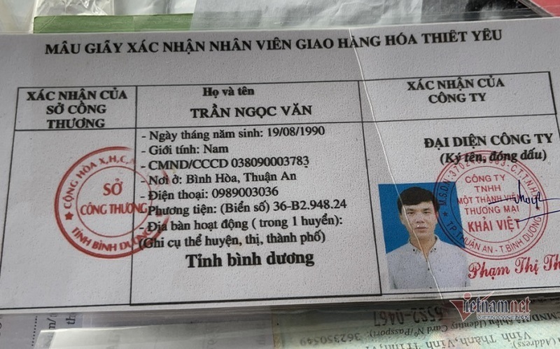 Tại đây, Văn thừa nhận giấy xác nhận nhân viên giao hàng thiết yếu nêu trên là giả. Để được qua chốt kiểm soát đi giao hàng, người này đã lên mạng tải mẫu giấy xác nhận và dấu mộc đỏ của Sở Công thương tỉnh Bình Dương cùng dấu mộc đỏ của công ty dịch vụ, sau đó in ra giấy để qua mắt lực lượng chức năng.