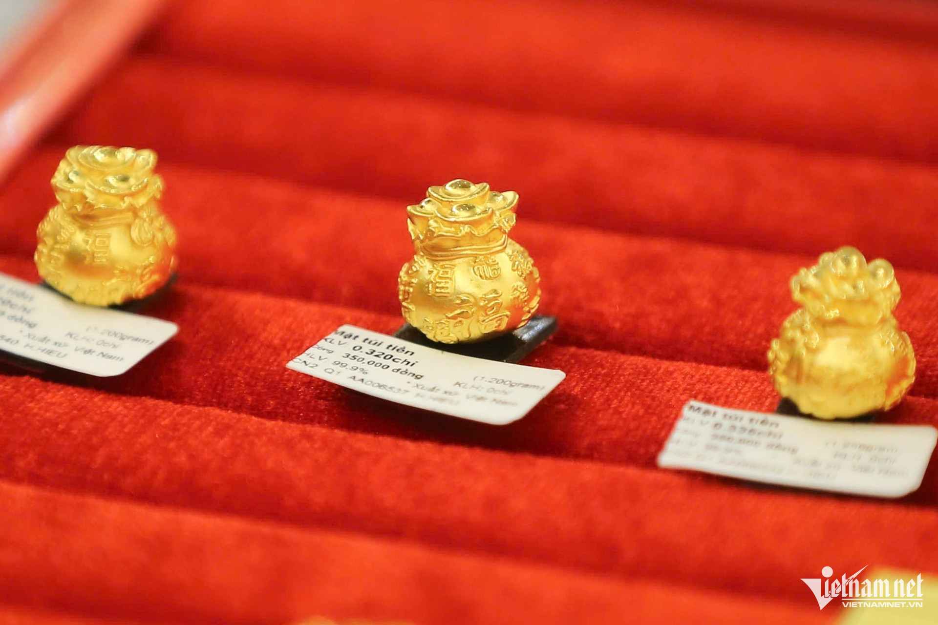 Bên cạnh sản phẩm quen thuộc như túi tiền, thỏi vàng, nữ trang hình linh vật rắn cũng được cửa hàng này tung ra thị trường. Tại Công ty cổ phần Tập đoàn Vàng bạc đá quý Doji, lúc 8h sáng nay, giá vàng miếng SJC niêm yết mức 86,5-90 triệu đồng/lượng (mua - bán). Đến 9h sáng, giá vàng miếng SJC tại đây được điều chỉnh tăng, ở mức 86,8-90,3 triệu đồng.