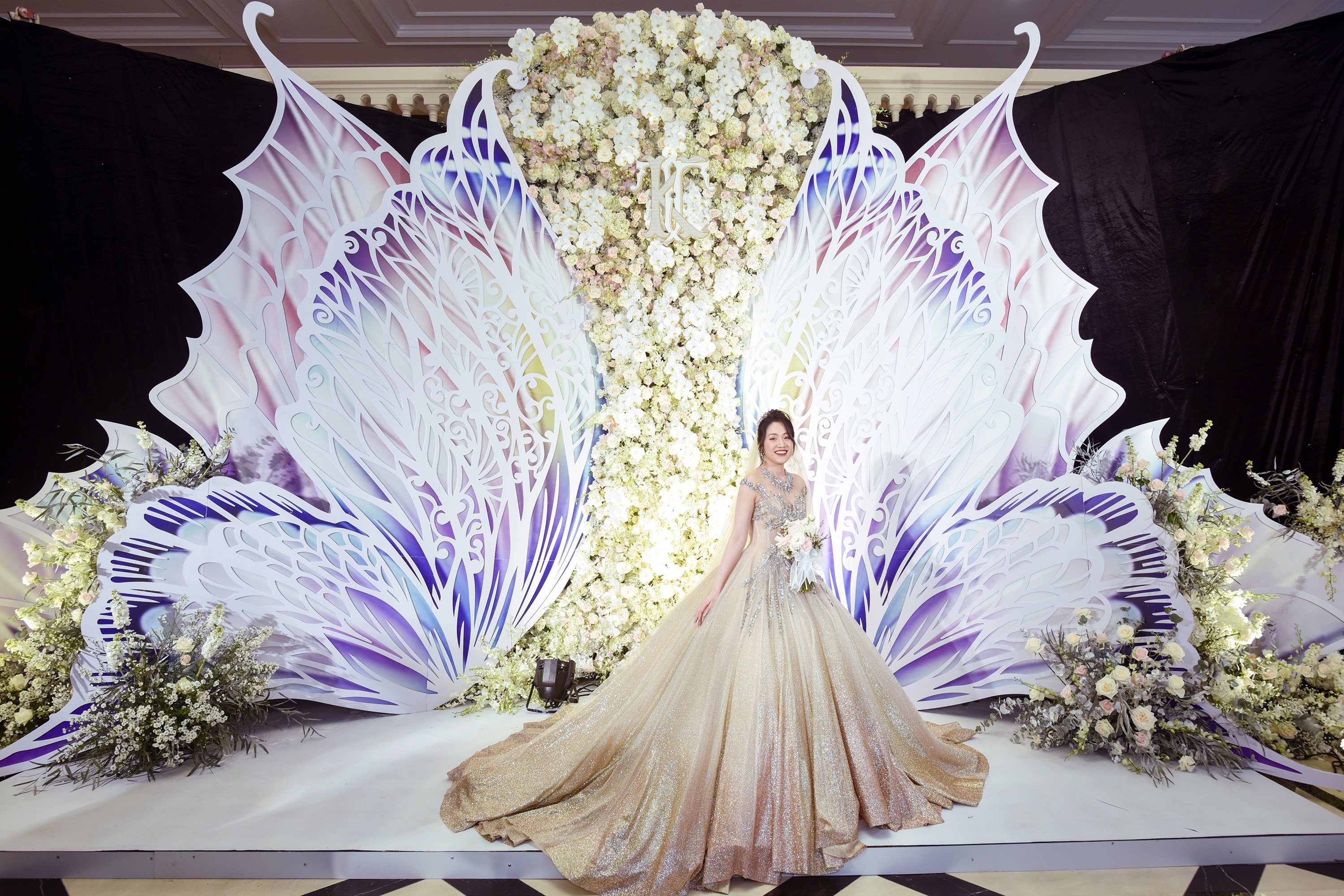 Do dịch bệnh phức tạp, cặp đôi đã phải hoãn cưới nhiều lần. Họ đã dành gần một năm để chuẩn bị cho sự kiện quan trọng trong đời. Chia sẻ với Dân trí, anh Phạm Khôi cho biết: Anh muốn có không gian cưới lãng mạn, tinh tế, thể hiện được cá tính của cô dâu và câu chuyện tình yêu cách nửa vòng trái đất. Vì vậy, hình ảnh xuất hiện trọng tâm trong không gian tiệc cưới là cánh bướm và vương miện.