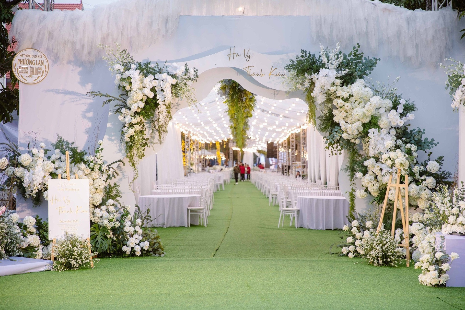 Từ cổng hoa, backdrop, đồ trang trí, sân khấu, phông cưới, đường dẫn... đều được thiết kế theo ý tưởng của cô dâu chú rể. Toàn bộ hoa tươi gồm 80% hoa hồng nhập khẩu và 20% hoa thạch thảo trắng sử dụng trang trí đám cưới của Hà Vy được 10 thợ cắm hoa lành nghề cắm trong 2 ngày mới hoàn thành. Riêng phần rạp có mái trong suốt làm từ PVC, may mới 100% và kéo dài 150m là đã thể hiện độ chịu chi của gia chủ, anh Phương bật mí.