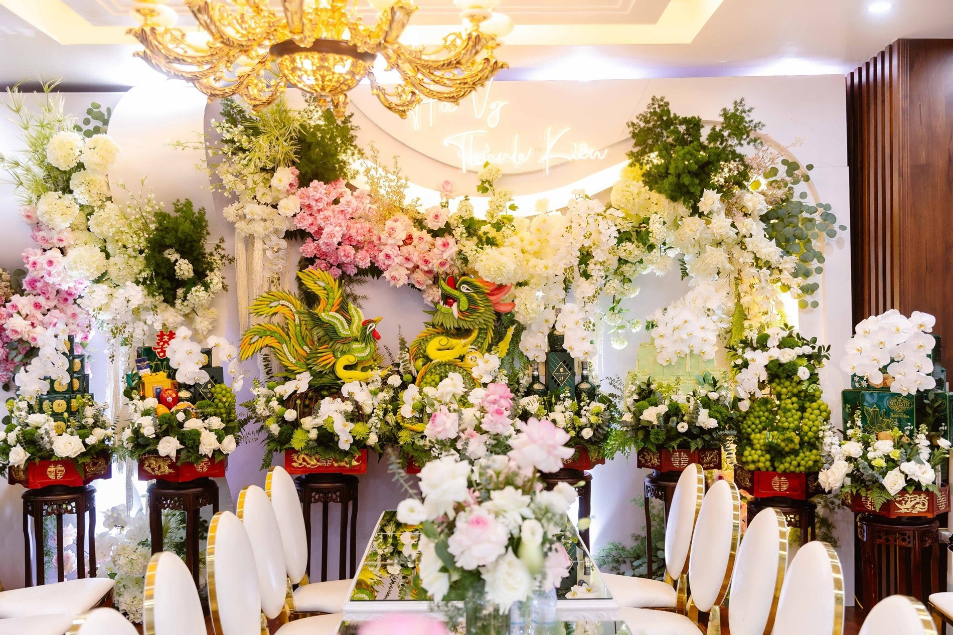Nhà cô dâu và chú rể cách nhau chỉ hơn 1km. Trong ngày ăn hỏi, đàng trai đã điều 11 chiếc xe điện chở theo 11 tráp lễ rất sang trọng tới nhà gái. Hôm sau, trong lễ rước dâu, 22 siêu xe như Rolls-Royce, Jaguar, Lexus, Porsche... diễu hành trên phố đưa cặp đôi tới hôn trường trong sự hân hoan chúc phúc của mọi người.