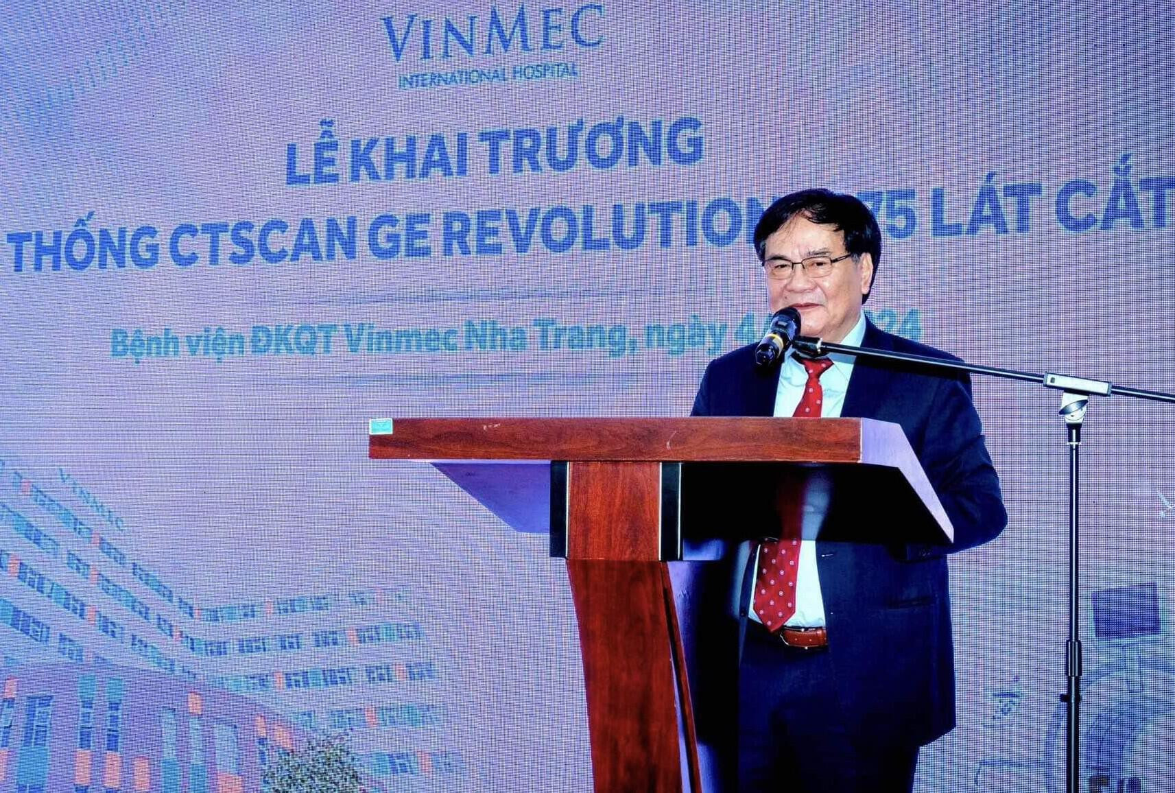 Phát biểu tại sự kiện, GS.TS.BS Bùi Đức Phú - Chủ tịch Hội đồng Tim mạch - Hệ thống Y tế Vinmec, cho biết: “Là đơn vị y tế đầu tiên tại khu vực miền Trung triển khai Hệ thống CTScan GE Revolution Apex 1975 lát cắt, Vinmec Nha Trang tự hào mang đến cho người dân địa phương dịch vụ chẩn đoán tiên tiến nhất hiện nay. Hệ thống là minh chứng cho những quyết tâm của Vinmec trong việc hướng tới những tiêu chuẩn y khoa quốc tế, đáp ứng nhu cầu chẩn đoán chính xác của bệnh nhân, chung tay trong đảm bảo sức khỏe cộng đồng”.