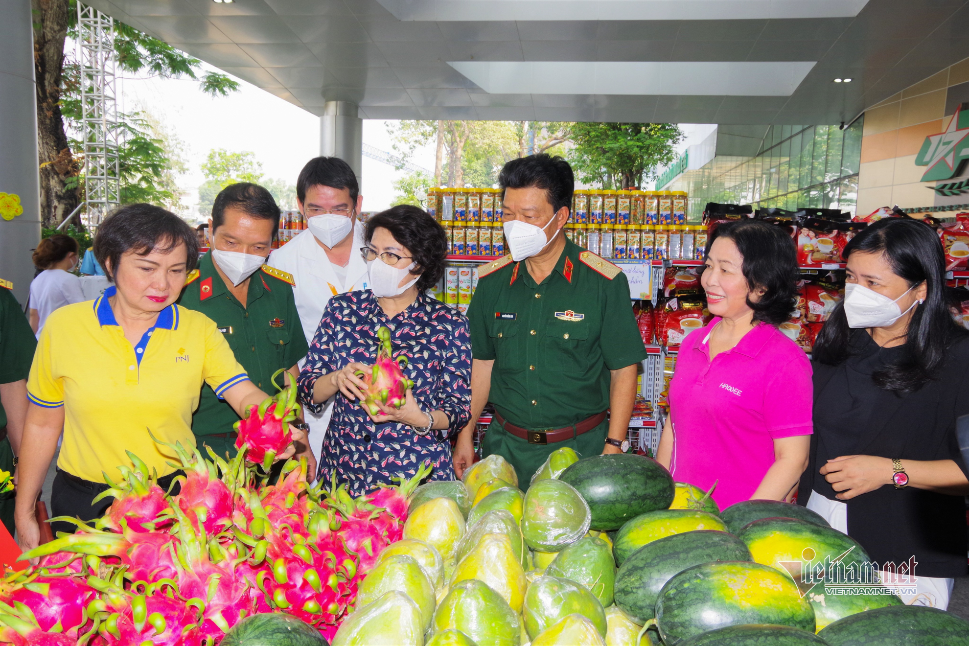| Bà Tô Thị Bích Châu, Chủ tịch Ủy ban MTTQ Việt Nam TP.HCM, lãnh đạo Bệnh viện Quân y 175 cùng nhà tài trợ trong buổi khai trương siêu thị 0 đồng tại bệnh viện Quân y 175. |