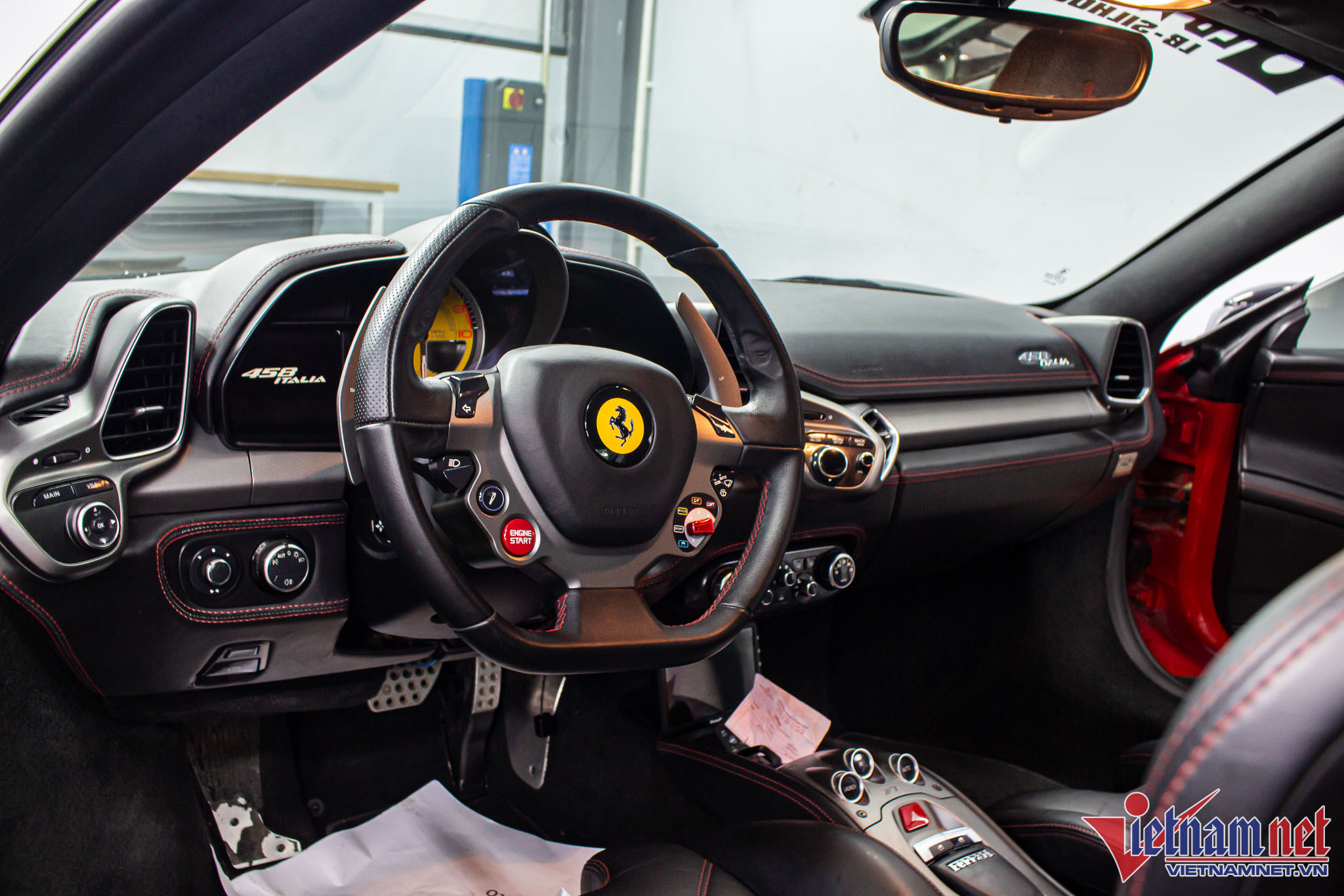 Khoang nội thất của chiếc Ferrari 458 Italia này sử dụng tông màu đen chủ đạo, điểm xuyết bằng đường chỉ khâu màu đỏ. Nhiều chi tiết bọc da đã xuất hiện vết nhăn sau thời gian dài sử dụng. Cửa gió điều hòa, bảng điều khiển và táp-lô không có tùy chọn chất liệu carbon.