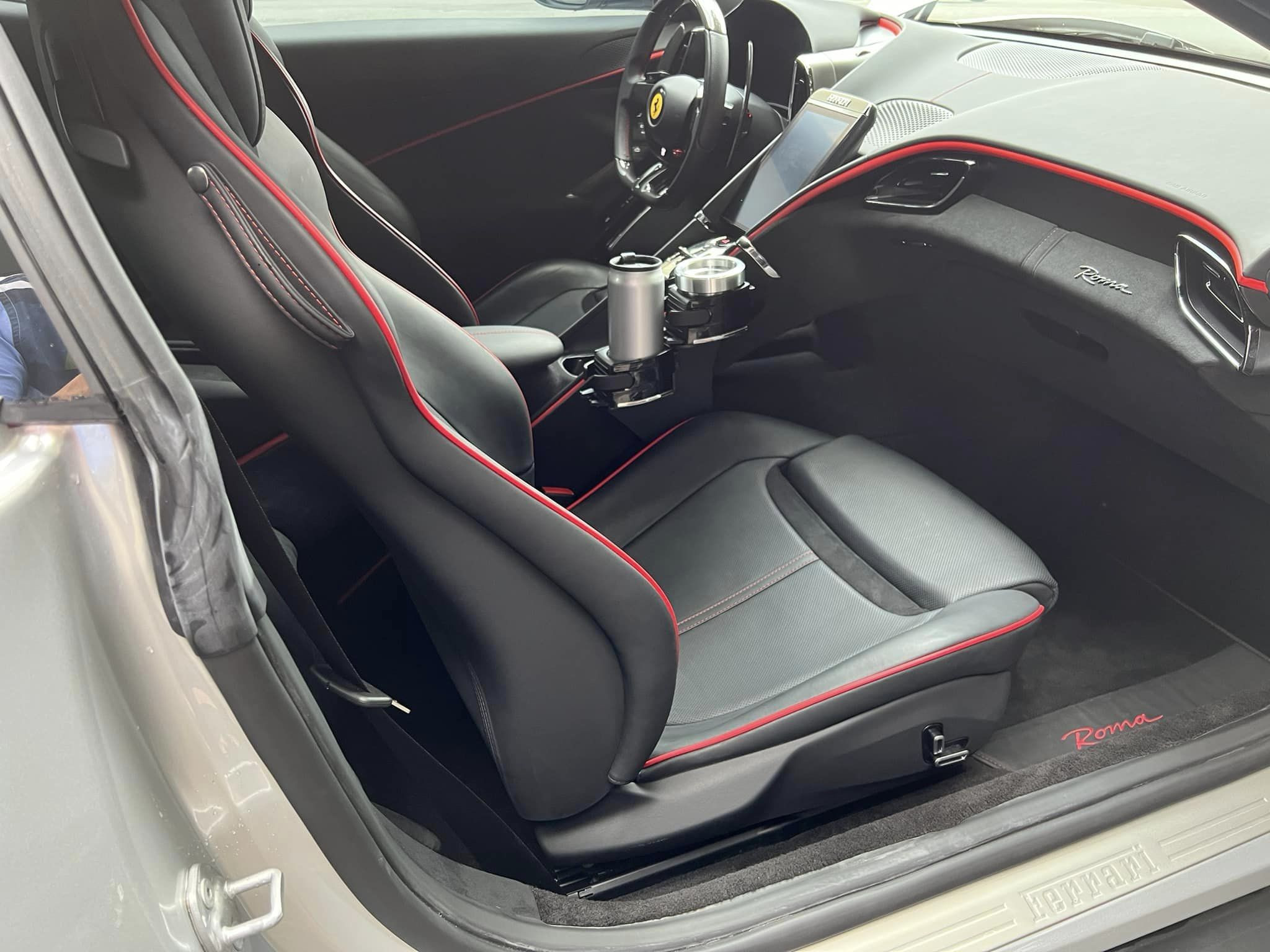 Nội thất của chiếc Ferrari Roma không có nhiều điểm khác biệt so với thời điểm được mang về Việt Nam. Nhiều chi tiết trang trí tại không gian này có màu đỏ tương đồng với màu sơn ngoại thất gốc. Tuy vậy, cách bố trí nhiều tính năng vận hành nội thất được làm hiện đại hơn với bảng đồng hồ taplo kỹ thuật số và màn hình giải trí trung tâm cảm ứng đặt dọc. Đặc biệt hơn, ông Vũ đã cho lắp đặt bộ khung giữ ly cà phê riêng, một chi tiết được bắt gặp trên hầu hết những mẫu xe thuộc bộ sưu tập này.