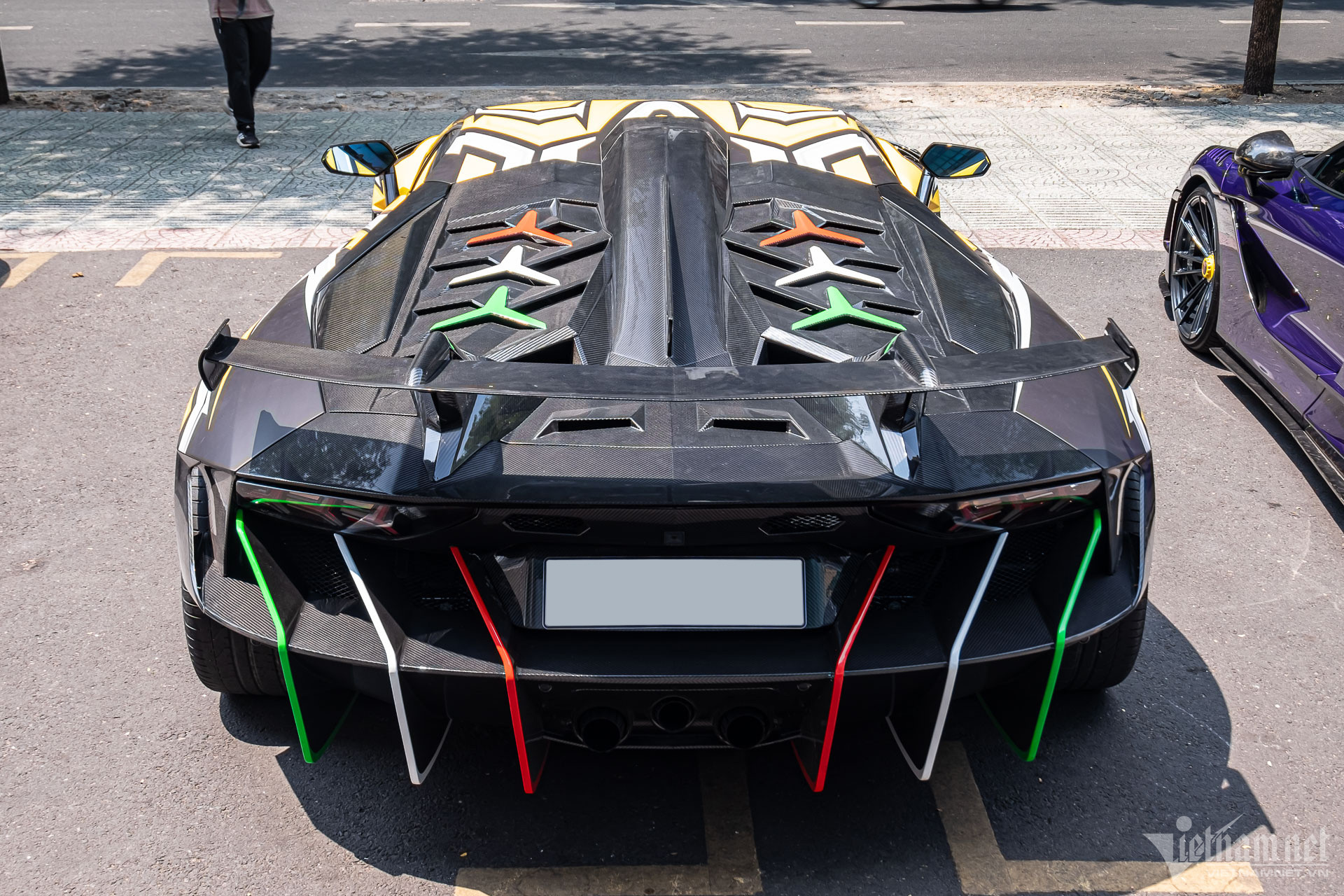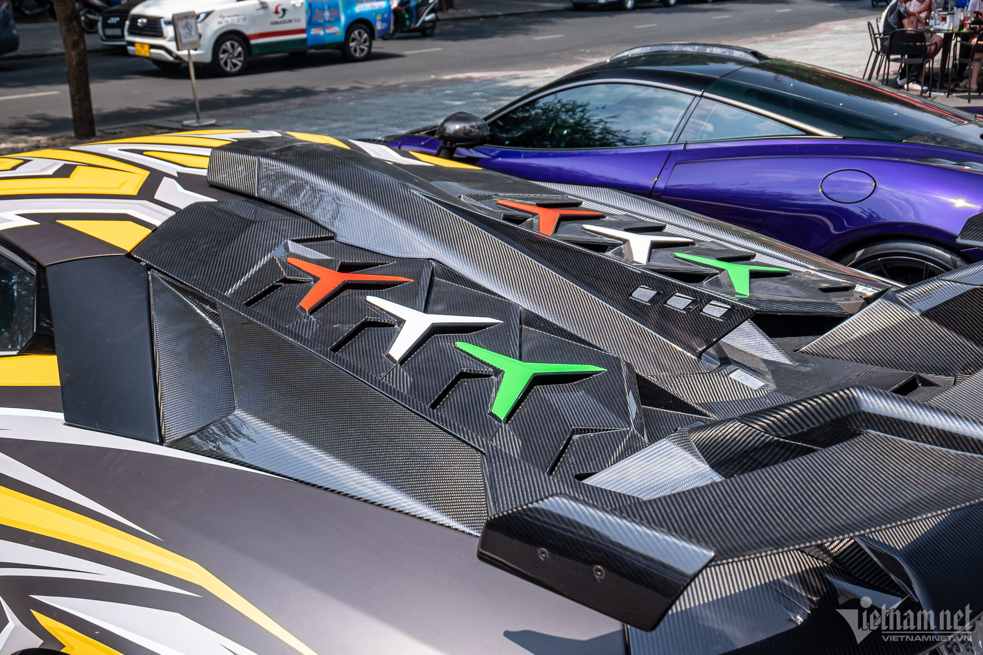 Điểm nổi bật nhất trên chiếc Lamborghini Aventador này nằm ở đuôi xe, lấy cảm hứng từ mẫu Lamborghini Centenario triệu đô. Cản sau gồm nhiều cánh chia gió cỡ lớn với độ cắt xẻ mạnh, để lộ bánh sau của xe. Bên trên là cánh gió cỡ lớn, song chi tiết này chỉ làm tăng vẻ hầm hố cho chiếc siêu xe.