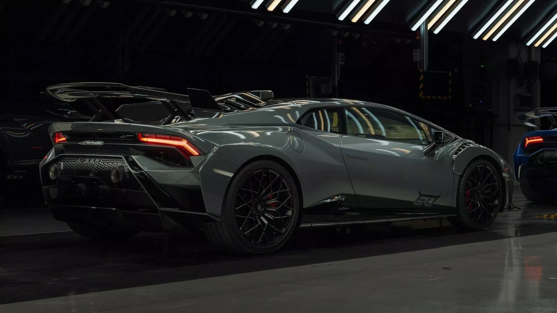 Biến thể còn lại của Huracan STO 60th Anniversario có thân xe màu xám và đen kết hợp với sợi carbon tùy chọn, bên trong không gian nội thất là màu đen và xám của vật liệu Alcantara, điểm xuyết bằng đường chi tiết khâu và da màu đỏ. Cả hai biến thể đều trang bị bộ vành nhôm kích thước 20 inch sơn màu đen mờ.