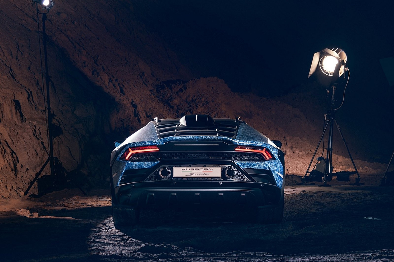 Ba màu lặp đi lặp lại trên chiếc Huracan bản off-road, sơn bằng tay để tạo ra "hiệu ứng pha lê" của chất lỏng đông lạnh, trong đó tông xanh nhạt Blu Amnis được sử dụng làm màu sơn nền.
