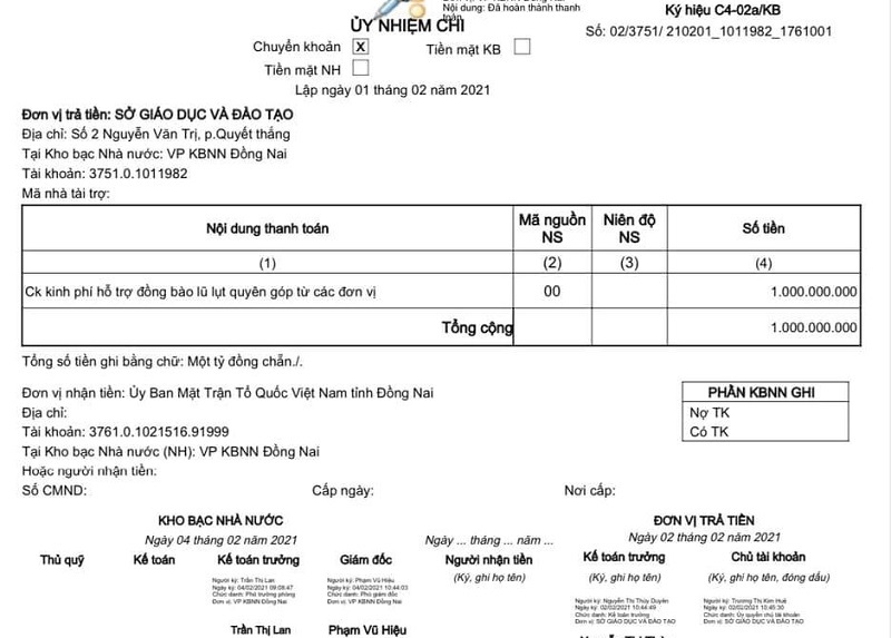 Sau khi nhận được tiền ủng hộ, Sở đã chuyển khoản trực tiếp đến các tỉnh nêu trên và thông qua Ủy ban MTTQVN tỉnh Đồng Nai.
