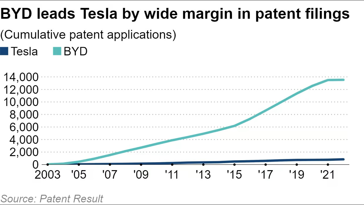 Theo Patent Result, từ khi thành lập vào năm 2003 đến năm 2022, Tesla đã nộp đơn đăng ký 836 bằng sáng chế, trong khi BYD đã nộp hơn 13.000 bằng sáng chế trong cùng khoảng thời gian.