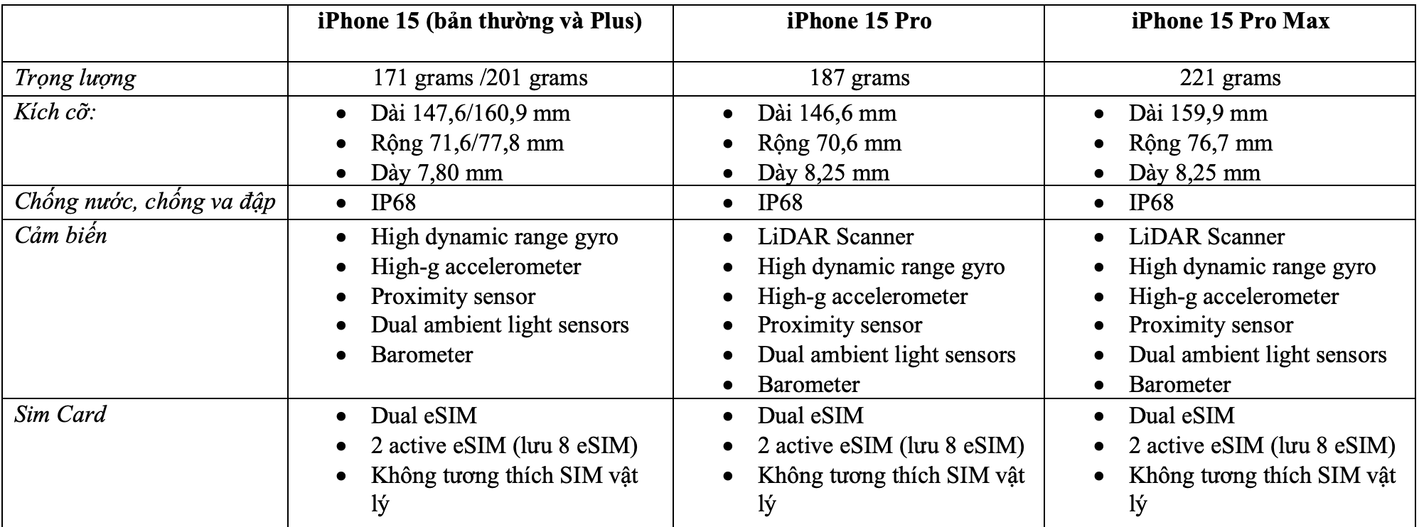 Apple vừa công bố bốn mẫu iPhone 15 mới trong sự kiện Wonderlust, bao gồm iPhone 15, 15 Plus, 15 Pro và 15 Pro Max. iPhone 15 và 15 Pro dùng màn hình 6.1 inch, còn iPhone 15 Plus và 15 Pro Max dùng màn hình 6.7 inch.