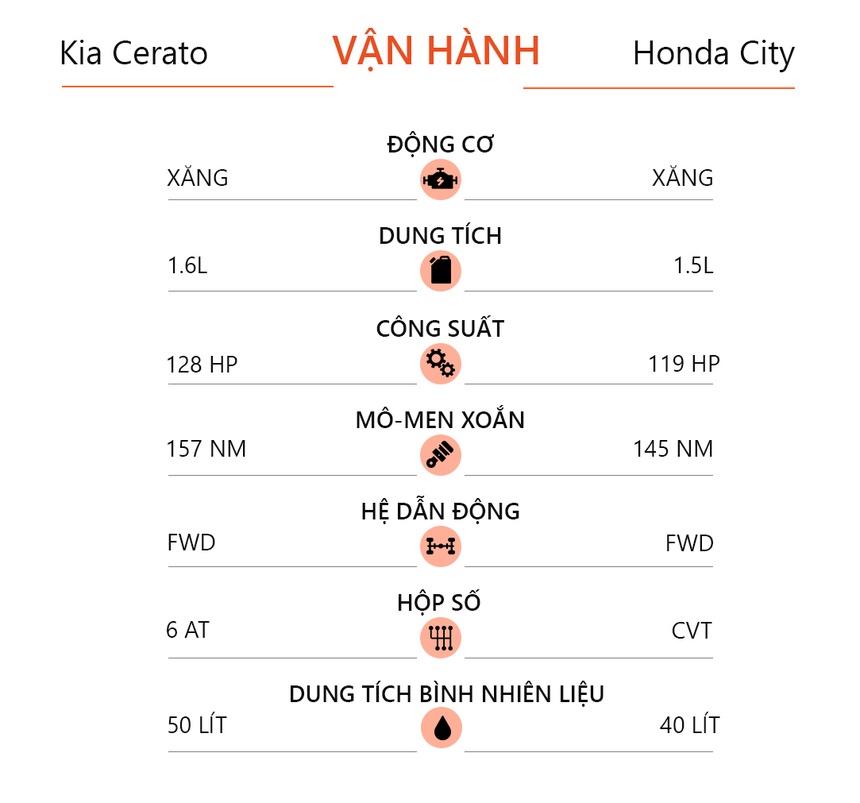 Thông số động cơ của Kia Cerato cao hơn Honda City RS được trang bị động cơ xăng 1.5L, công suất 119 mã lực, mô-men xoắn 145 Nm. City sử dụng hộp số vô cấp CVT và hệ dẫn động cầu trước.