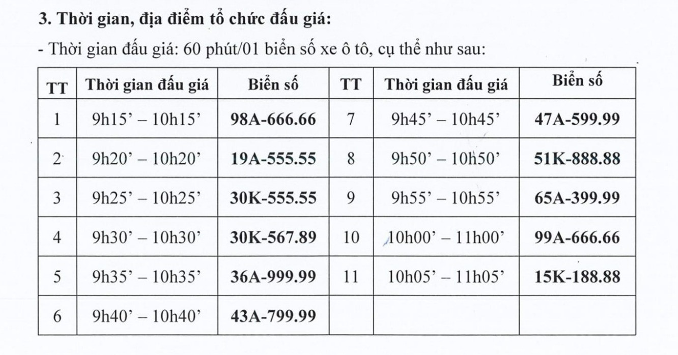 Thời gian đấu giá là 60 phút/1 biển số ô tô. Biển số đầu tiên mở hàng là biển số của tỉnh Bắc Giang: 98A- 666.66 bắt đầu từ 9h15 và biển số cuối cùng sẽ được mở là biển số của TP. Hải Phòng: 15K-188.88 vào lúc 10h05'. Kết thúc toàn phiên đấu giá là lúc 11h05'. Trong đó, cách 5 phút, hệ thống đấu giá trực tuyến sẽ mở thêm 1 biển số tiếp theo.