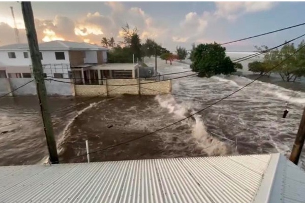 | Nước biển tràn vào đất liền sau khi sóng thần tấn công đảo lớn nhất ở Tonga. Ảnh: CNN |