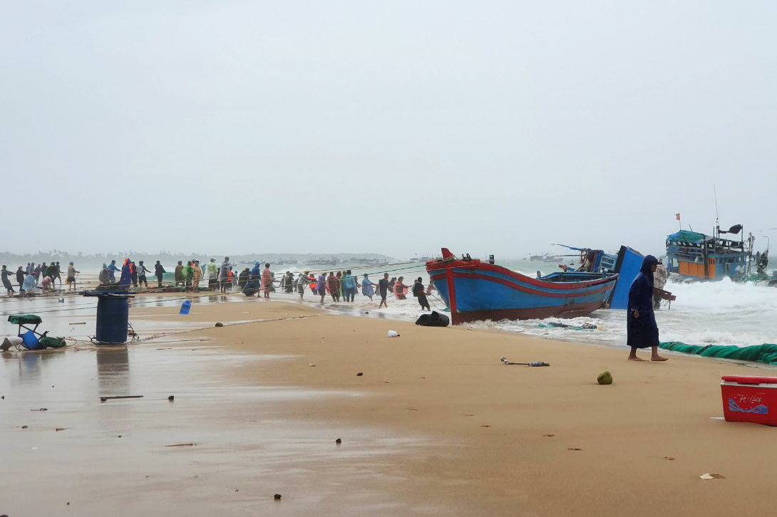 | Tàu thuyền ngư dân neo gần bờ biển ở Phú Yên bị sóng đánh chìm. |