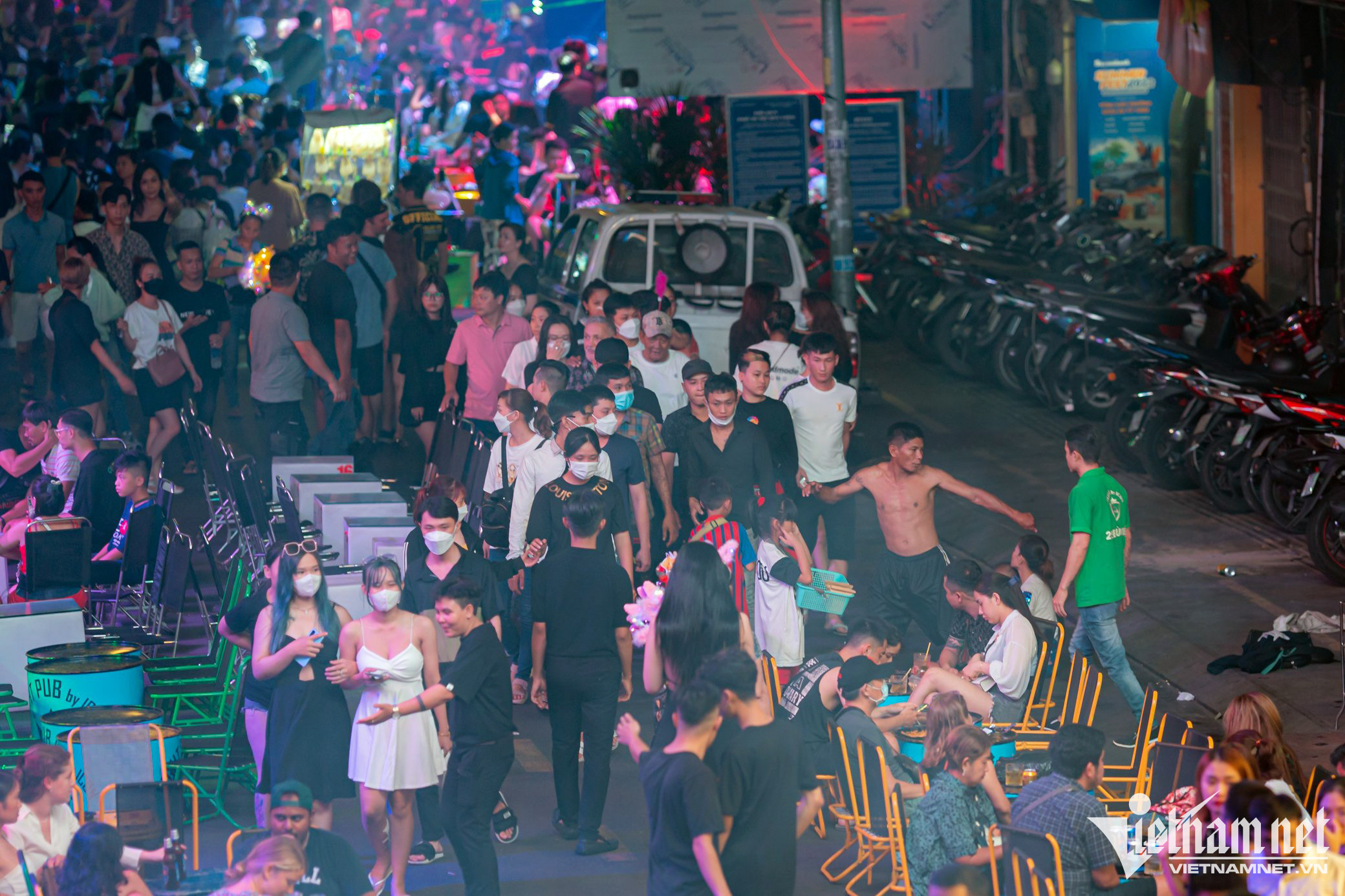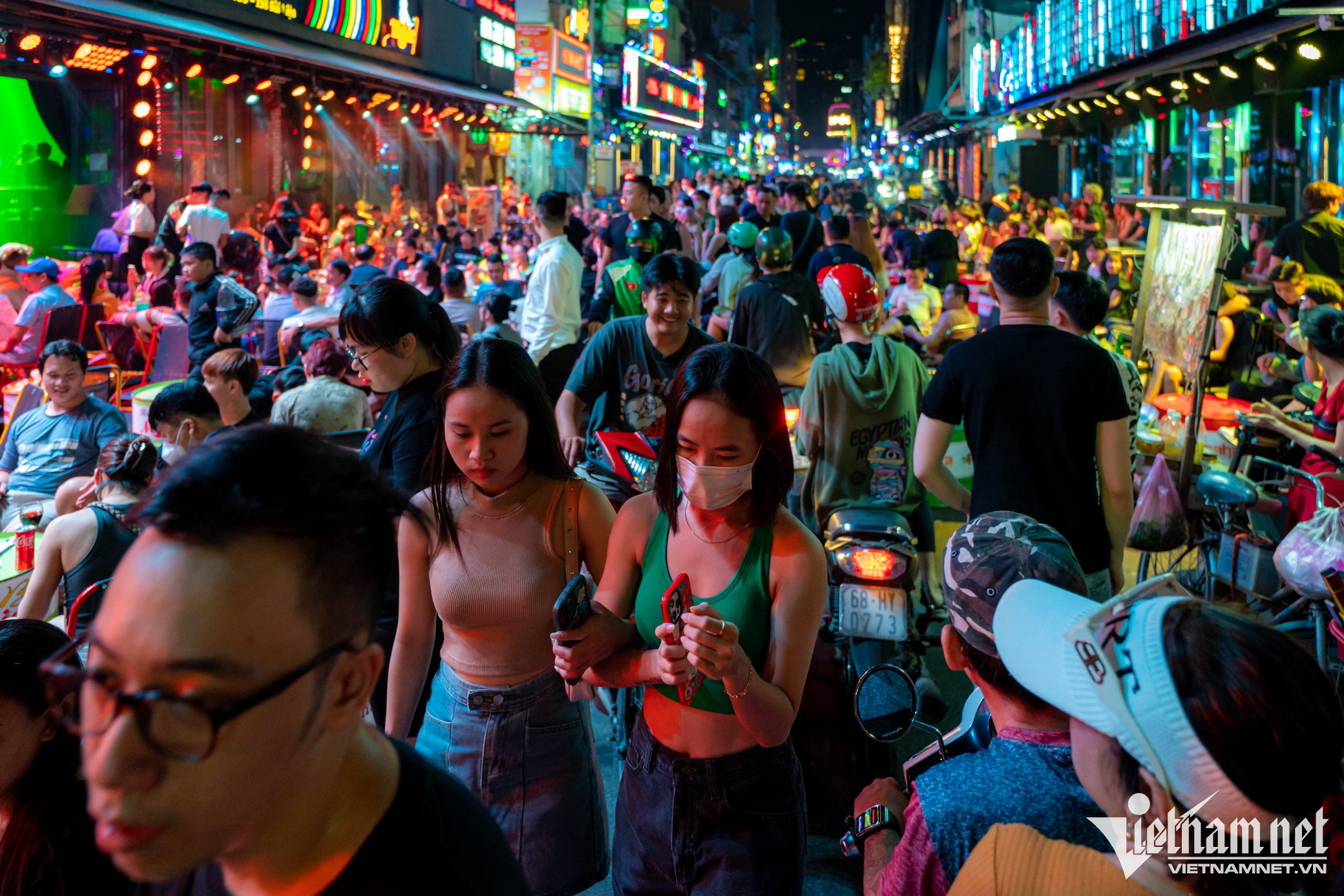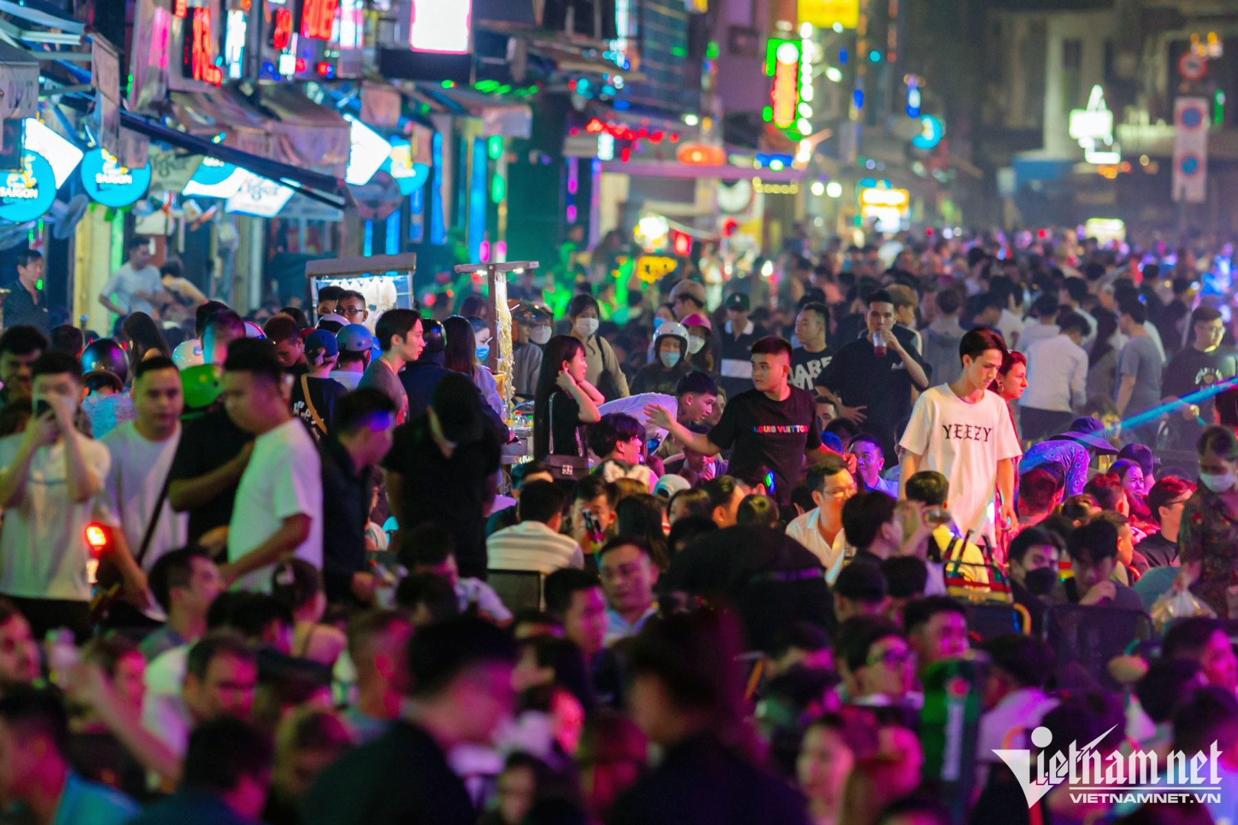 Tại đây, nhiều khách ngồi ăn tại hàng quán còn sử dụng thêm bóng cười (chứa chất N2O). Dù chưa có quy định cấm nhưng khí N2O chỉ được phép mua bán, sản xuất với mục đích sử dụng trong công nghiệp, chưa được cấp phép mua bán, sản xuất với mục đích sử dụng cho con người.Cùng lúc này nút giao Đề Thám - Bùi Viện có lượng xe cộ tăng đột biến, từ ôtô cá nhân tới taxi, ra vào liên tục.Là một trong những trung tâm vui chơi, giải trí dành cho người Việt lẫn du khách nước ngoài, phố đi bộ Bùi Viện đông đúc mỗi dịp cuối tuần. Nơi đây tập trung nhiều trò tiêu khiển được giới trẻ ưa chuộng.Dù học sinh đã trở lại trường, nhiều thành phố lớn vẫn đang trong giai đoạn cao điểm du lịch. Du khách nước ngoài lúc này đến TP.HCM cũng tăng đáng kể từ sau dịch Covid-19.Một du khách nước ngoài quay video livestream khu vực này khoe với bạn bè lúc gần 1h sáng.Càng về khuya, số người tới đây càng đông hơn, lối đi ở giữa chỉ còn rộng hơn 1 mét.Các nhà hàng, quán bar dùng chiêu thu hút khách theo phong cách phố Tây ở Pattaya (Thái Lan) khi tổ chức vũ công biểu diễn ở gần cửa.Dù đông đúc ngoài vỉa hè và lòng đường, cảnh chào mời khách vẫn diễn ra do bên trong nhiều quán vẫn còn chỗ trống.Anh Công Sơn (ở quận 8) cho biết cuối tuần nào cũng đưa người yêu đến đây giải trí. "Có lúc chúng tôi chỉ uống mỗi người một chai bia, ngồi nghe nhạc là chủ yếu, sau đó đi về", anh Sơn chia sẻ.Đôi bạn trẻ sống ở Bình Dương cho biết đây là lần đầu đến Bùi Viện, họ khá ấn tượng về sự náo nhiệt nơi này.Nhóm Thúy Vân (31 tuổi) từ Hà Nội vào TP.HCM để công tác. “Lần đầu đến đây, tôi cảm thấy vui vẻ, náo nhiệt không khác gì ở phố Tây - Tạ Hiện, Hà Nội”, Vân nói.