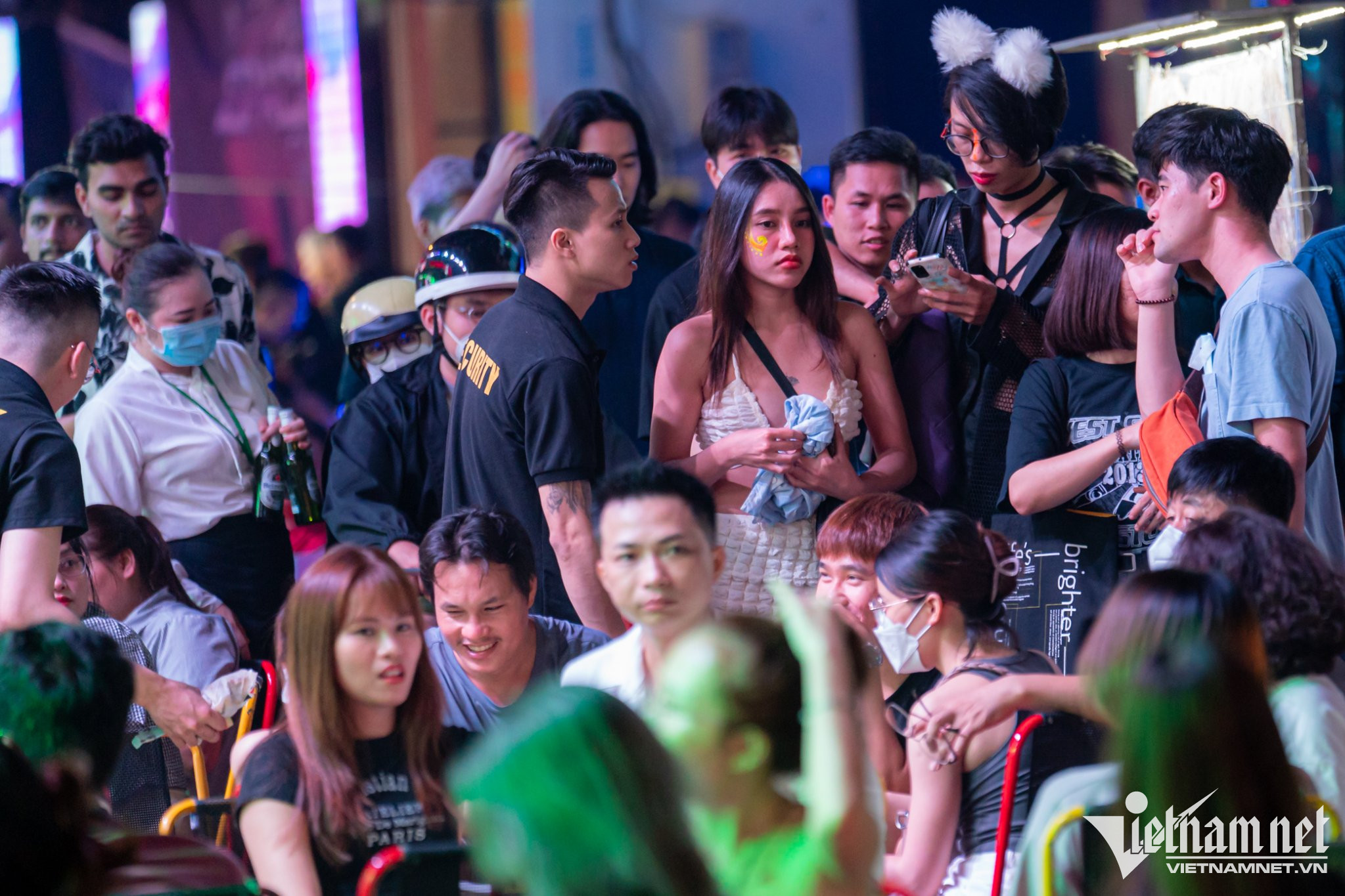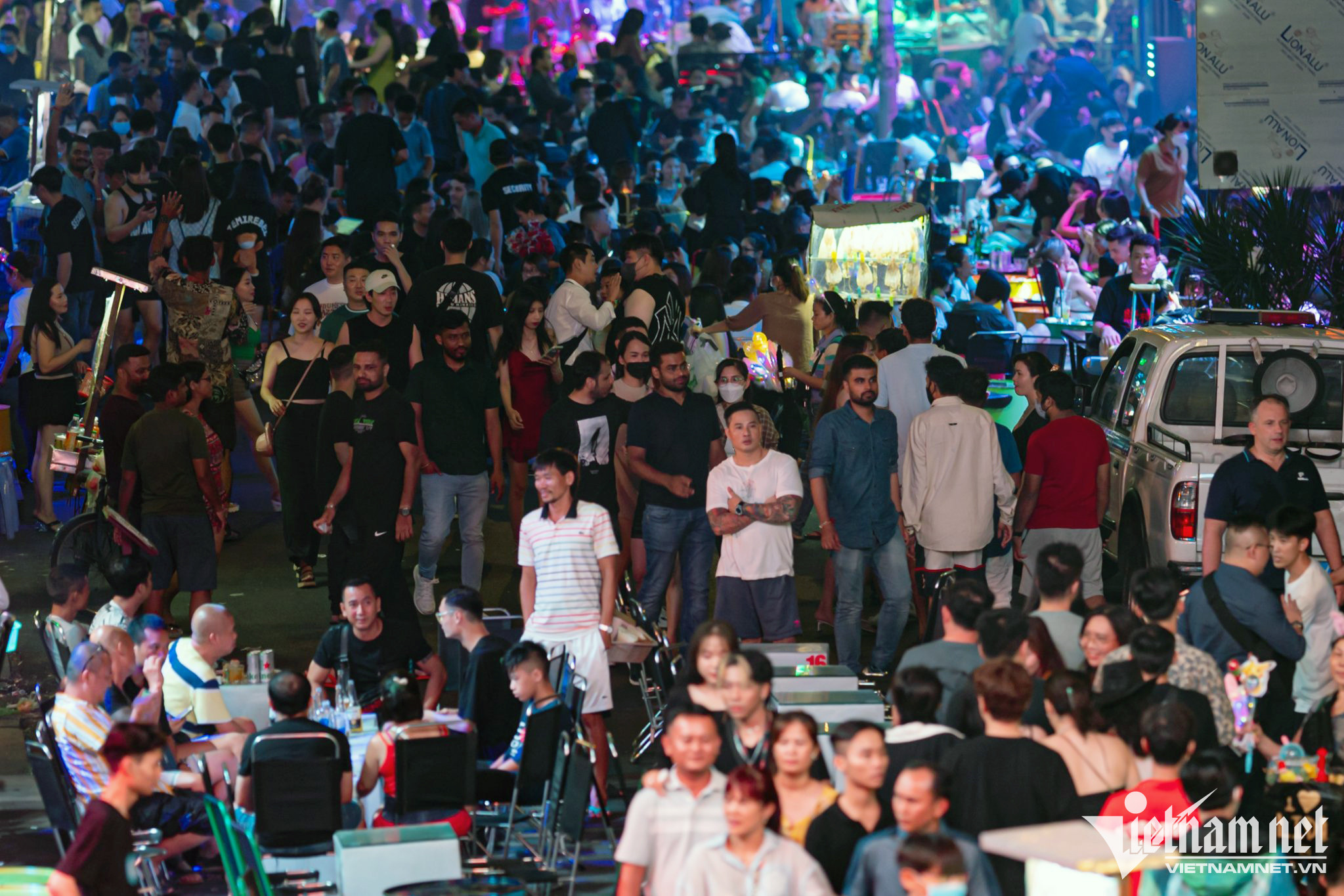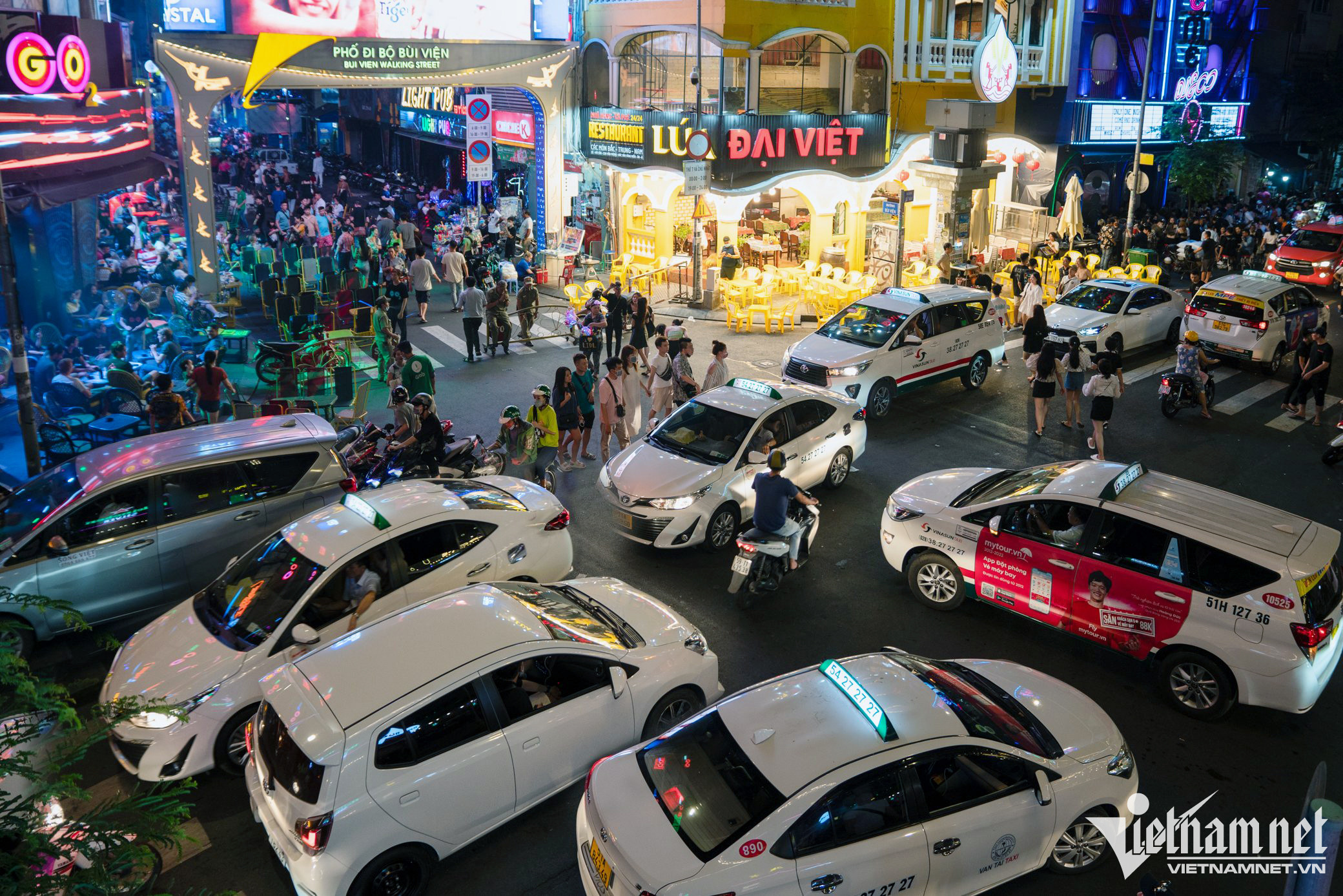 Tại đây, nhiều khách ngồi ăn tại hàng quán còn sử dụng thêm bóng cười (chứa chất N2O). Dù chưa có quy định cấm nhưng khí N2O chỉ được phép mua bán, sản xuất với mục đích sử dụng trong công nghiệp, chưa được cấp phép mua bán, sản xuất với mục đích sử dụng cho con người.Cùng lúc này nút giao Đề Thám - Bùi Viện có lượng xe cộ tăng đột biến, từ ôtô cá nhân tới taxi, ra vào liên tục.Là một trong những trung tâm vui chơi, giải trí dành cho người Việt lẫn du khách nước ngoài, phố đi bộ Bùi Viện đông đúc mỗi dịp cuối tuần. Nơi đây tập trung nhiều trò tiêu khiển được giới trẻ ưa chuộng.Dù học sinh đã trở lại trường, nhiều thành phố lớn vẫn đang trong giai đoạn cao điểm du lịch. Du khách nước ngoài lúc này đến TP.HCM cũng tăng đáng kể từ sau dịch Covid-19.Một du khách nước ngoài quay video livestream khu vực này khoe với bạn bè lúc gần 1h sáng.Càng về khuya, số người tới đây càng đông hơn, lối đi ở giữa chỉ còn rộng hơn 1 mét.Các nhà hàng, quán bar dùng chiêu thu hút khách theo phong cách phố Tây ở Pattaya (Thái Lan) khi tổ chức vũ công biểu diễn ở gần cửa.Dù đông đúc ngoài vỉa hè và lòng đường, cảnh chào mời khách vẫn diễn ra do bên trong nhiều quán vẫn còn chỗ trống.Anh Công Sơn (ở quận 8) cho biết cuối tuần nào cũng đưa người yêu đến đây giải trí. "Có lúc chúng tôi chỉ uống mỗi người một chai bia, ngồi nghe nhạc là chủ yếu, sau đó đi về", anh Sơn chia sẻ.Đôi bạn trẻ sống ở Bình Dương cho biết đây là lần đầu đến Bùi Viện, họ khá ấn tượng về sự náo nhiệt nơi này.Nhóm Thúy Vân (31 tuổi) từ Hà Nội vào TP.HCM để công tác. “Lần đầu đến đây, tôi cảm thấy vui vẻ, náo nhiệt không khác gì ở phố Tây - Tạ Hiện, Hà Nội”, Vân nói.