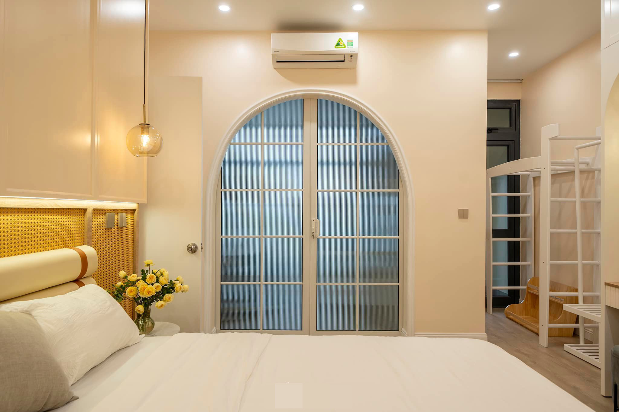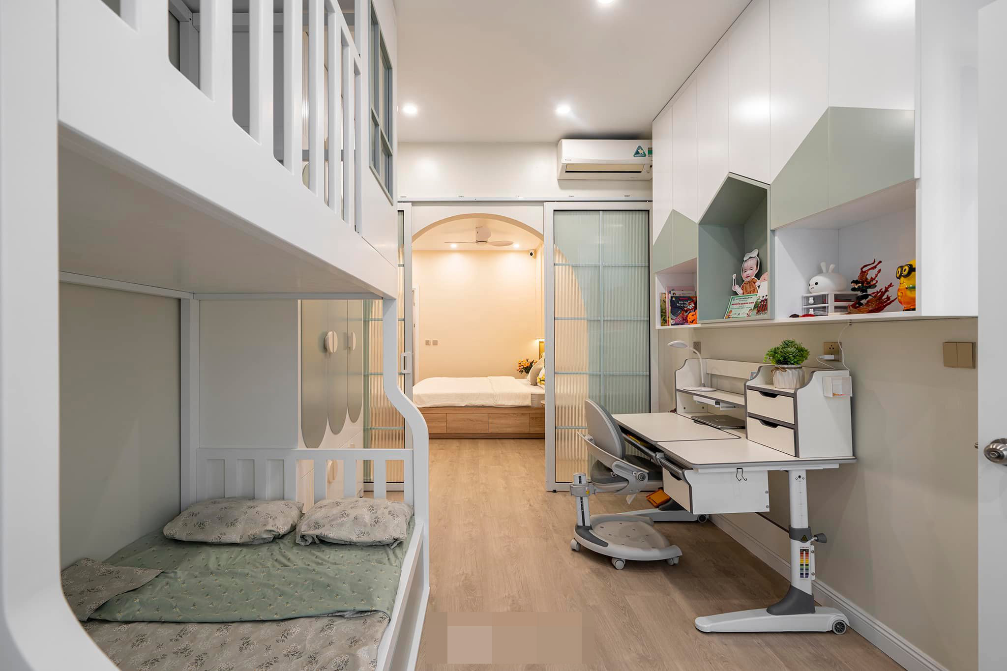 Hai bé nhỏ đang tập ngủ riêng, vì vậy gia chủ quyết định tạo 1 hệ cửa vòm thông giữa 2 phòng để các bé vẫn có cảm giác gần gũi bố mẹ trước khi vào giấc ngủ.