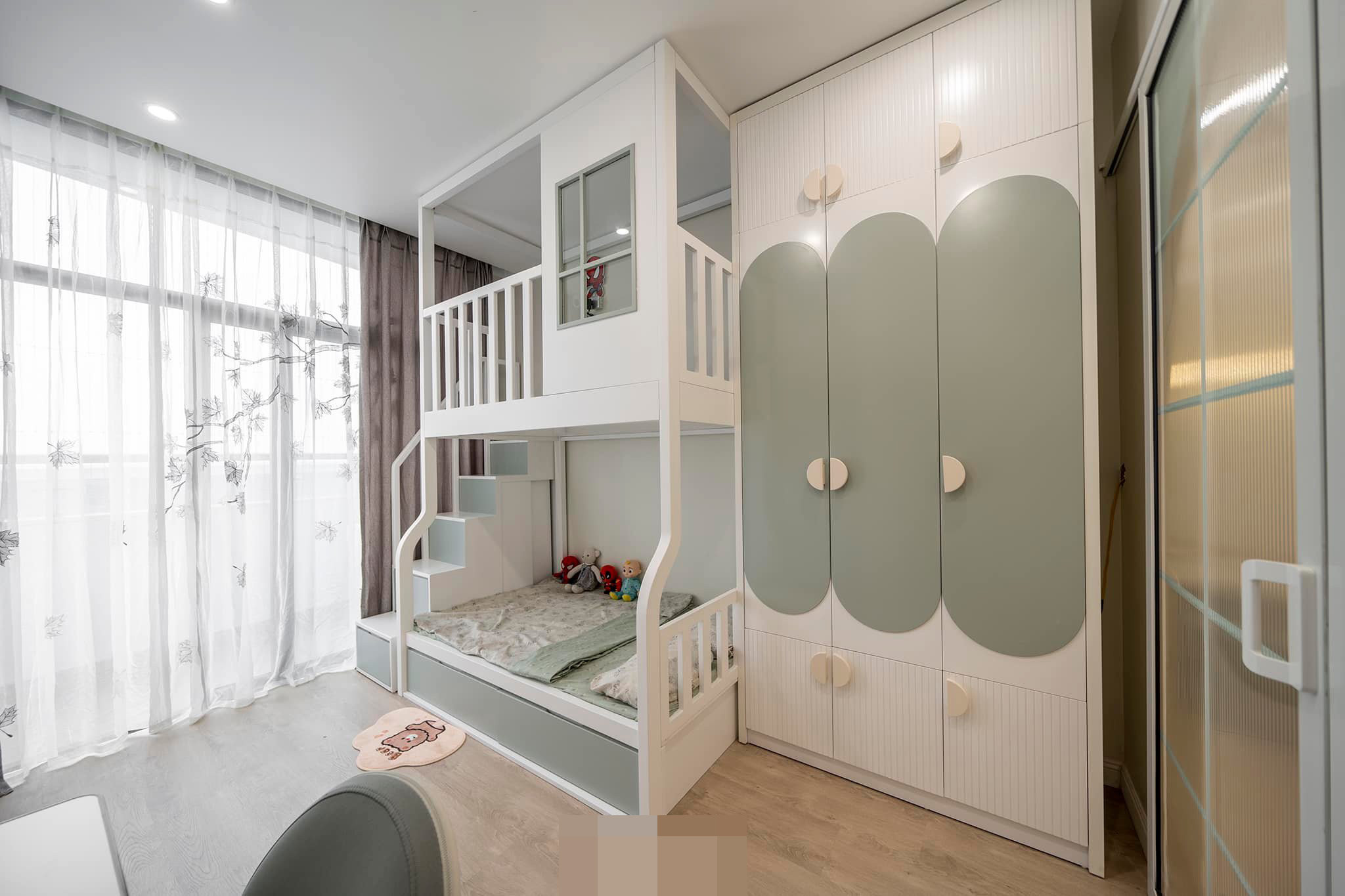 Hệ giường tầng, tủ quần áo liền khối tạo khoảng không cho bé chạy nhảy.