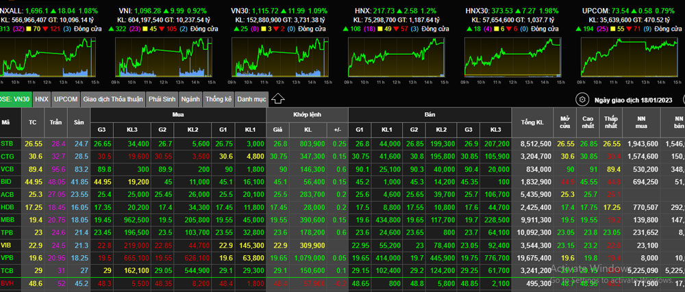 * Kết thúc phiên giao dịch 18/1, VN-Index tăng 9,99 điểm (+0,92 %) lên 1.098,28 điểm. HNX-Index tăng 2,58 điểm lên 217,73 điểm và UPCoM-Index tăng 0,58 điểm lên 73,54 điểm. Thanh khoản trên HoSE giảm 13% so với phiên trước với giá trị khớp lệnh đạt 9.384 tỷ đồng; tổng giá trị giao dịch trên HoSE đạt 10.238 tỷ đồng.