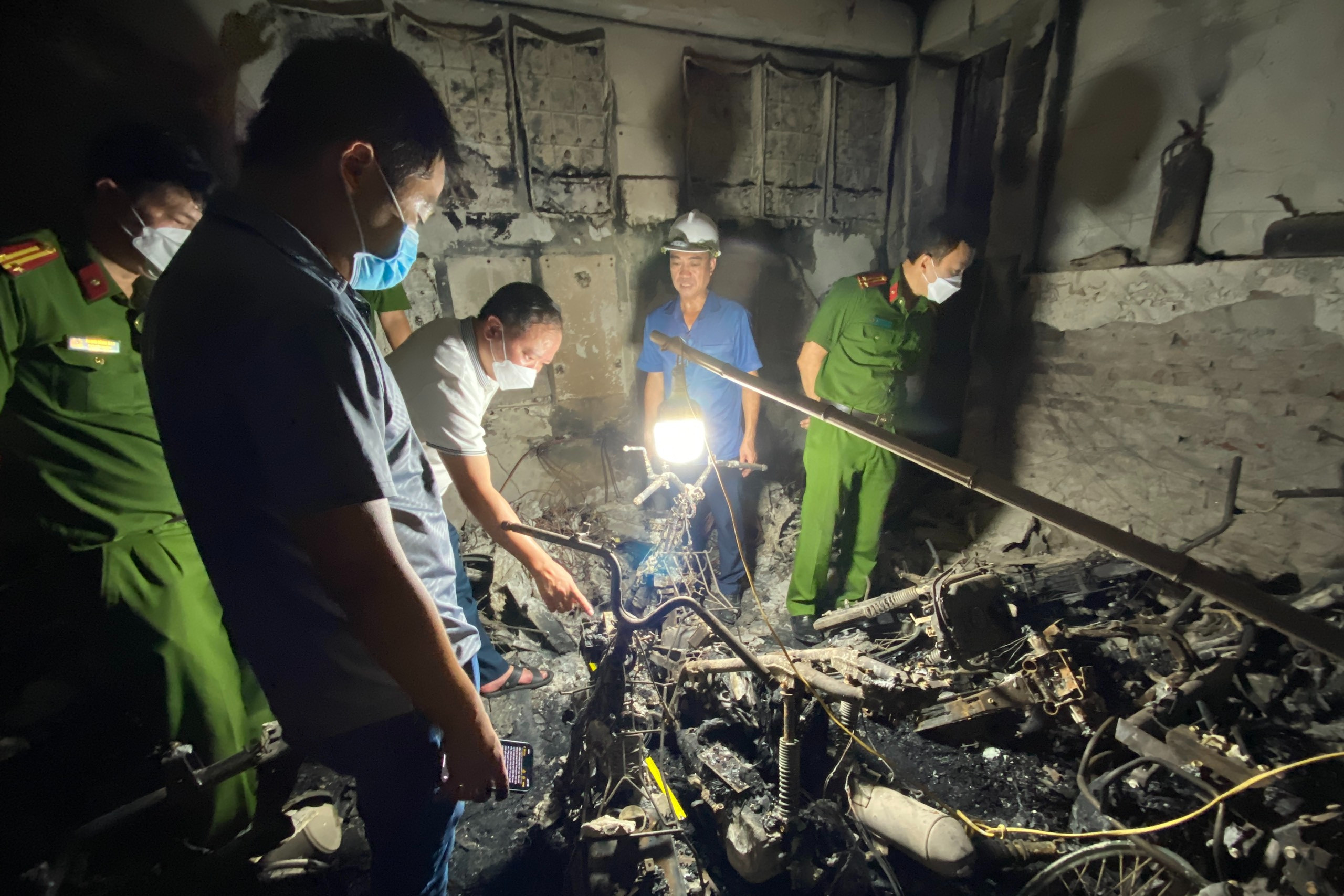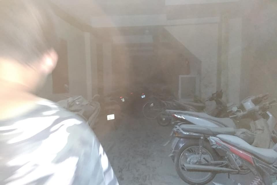“Lúc đầu nơi phát cháy chỉ nhỏ bằng bàn tay. Tôi lấy bình xịt để dập lửa nhưng càng xịt thì càng cháy to, sau đó lửa bén vào xe máy gây nổ, cháy lan tầng 1, khói bốc lên cao ”, người bảo vệ chung cư mini kể lại.