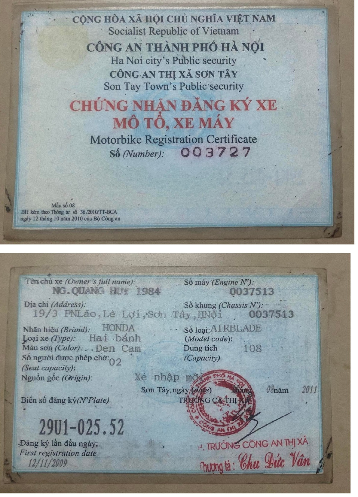 “Khoảng 1-2 tháng sau tôi tiếp tục nhờ em họ trình báo với Công an thị xã Sơn Tây, nơi tôi đăng ký xe trước đó để phòng trường hợp bị rút hồ sơ”, anh Huy kể lại.