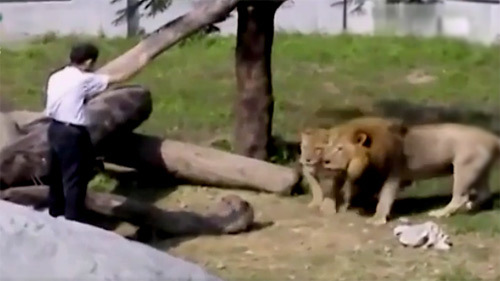 Video mới nhất công bố vụ việc từ năm 2004, khi một người đàn ông say cố tình lao vào khu vực của những con sư tử trong sở thú ở Đài Loan để 'nói chuyện' với chúng.