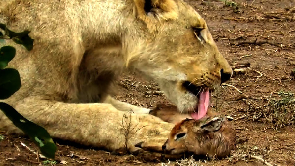 Đoạn video khiến người xem tò mò muốn biết, tại sao con sư tử đói lại nằm xuống cưng nựng một con linh dương non...