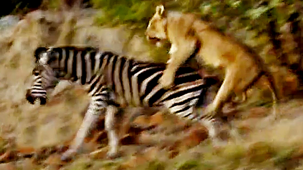 Sau những bước chân lướt trên cỏ nhẹ như gió, con sư tử tung mình hạ gục ngựa vằn chóng vánh.