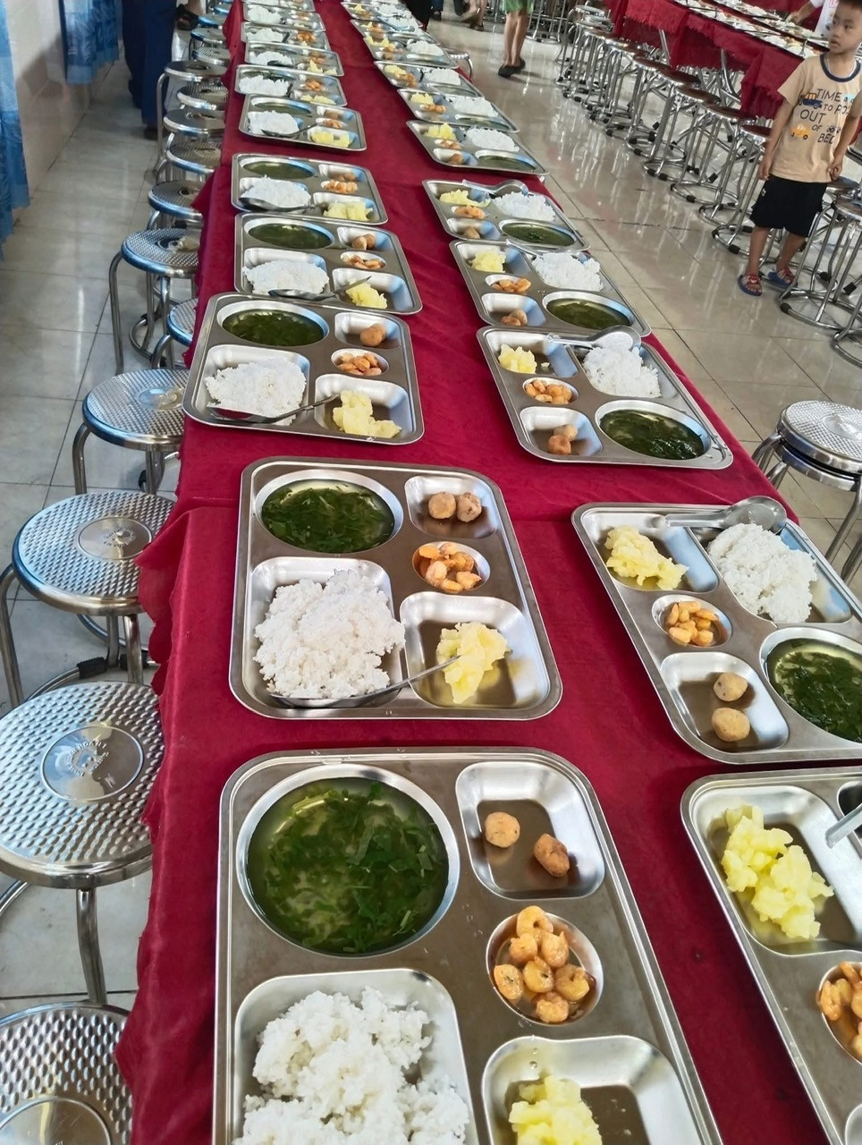 Hàng trăm học sinh ăn trưa trong phòng rộng rãi, sạch sẽ, có điều hòa. Mỗi em dùng khay inox riêng, chỗ ngồi được trải khăn gọn gàng. Thực đơn thay đổi hàng ngày với cơm, hai món mặn như tôm, thịt, một món xào và canh, đảm bảo đầy đủ dinh dưỡng, vệ sinh và an toàn thực phẩm.