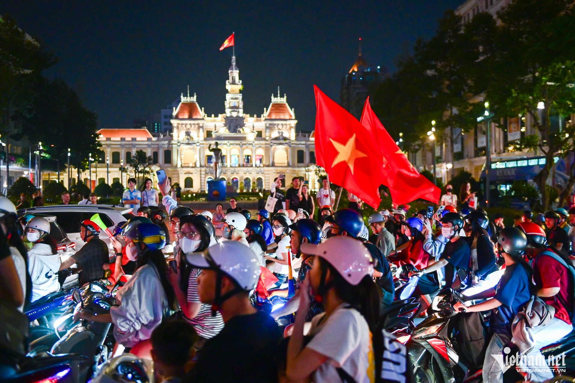 Đông đảo người hâm mộ bóng đá đổ về khu vực UBND TPHCM, phố đi bộ Nguyễn Huệ lúc 22h15, cầm theo cờ, kèn và các vật dụng khác để cổ vũ.