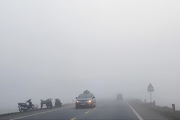 Dù là giữa trưa nhưng nhiều tòa cao tầng ở trung tâm Sài Gòn vẫn bị bao phủ bởi lớp mù, mờ ảo.