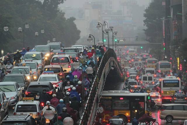 Khắp các ngả đường Hà Nội bị ùn tắc nghiêm trọng, người dân chôn chân trong mưa giữa xe cộ kẹt cứng.