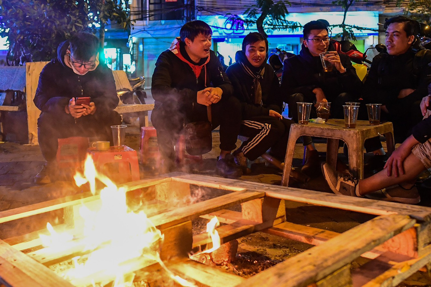 Nhiệt độ về đêm giảm sâu khiến nhiều người dân làm ăn, sinh hoạt trên hè phố ở Hà Nội phải đốt lửa sưởi ấm. Một số hàng quán giải khát cũng mang gỗ từ vật dụng bỏ đi ra đốt để phục vụ khách.