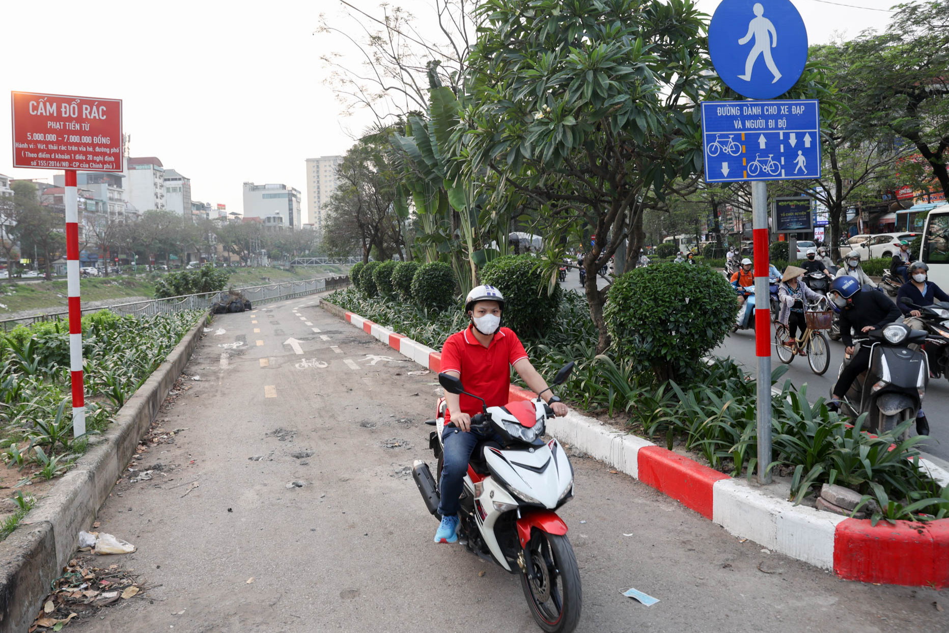 Loạt rào chắn ở đường dành cho xe đạp dọc sông Tô Lịch (Hà Nội) không còn. Rác thải bủa vây, người đi xe máy vô tư đi vào làn dù có biển cấm.