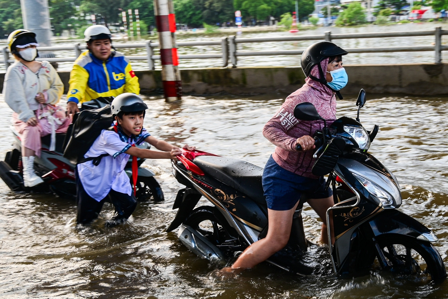 Triều cường dâng cao khiến nhiều đoạn đường ở quận 7 (TPHCM) bị ngập sâu. Người lớn, trẻ nhỏ chật vật dắt xe về nhà.