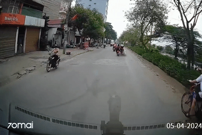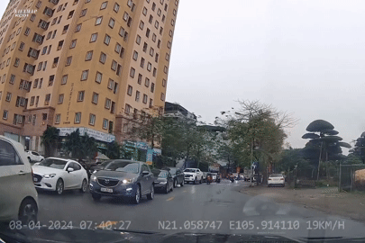 Chiếc xe máy chở hai nam thanh niên không đội mũ bảo hiểm, băng sang đường như chỗ không người bất chấp dòng phương tiện đang ùn ứ, suýt bị một ô tô nhãn hiệu BMW đâm phải.
