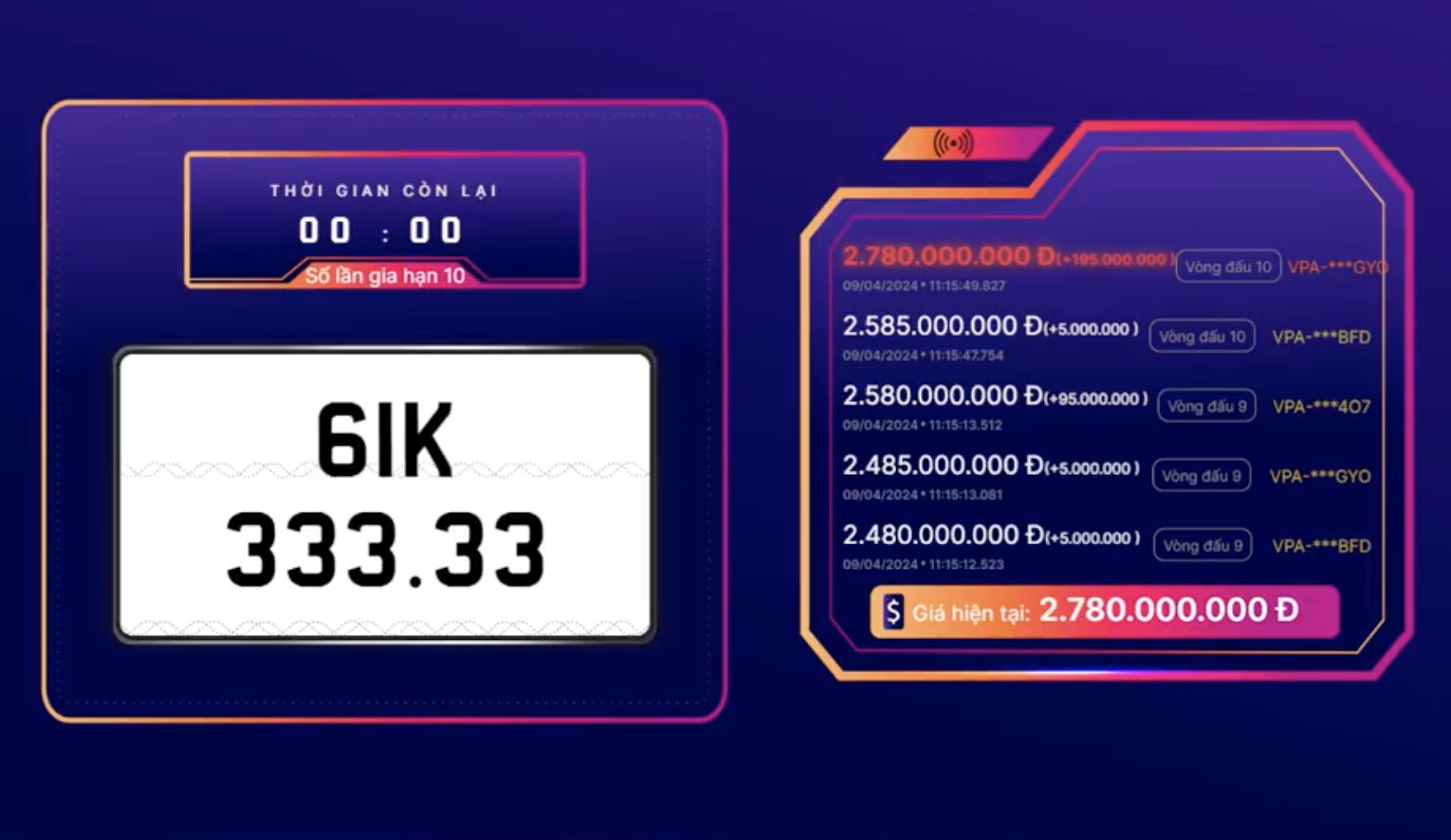 Đấu giá biển số sáng 15/4: Biển ngũ quý 2 của Hà Nội trúng giá 2,585 tỷ đồng
