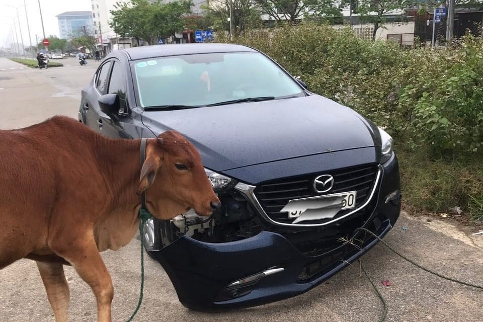 Những tưởng đỗ ô tô trên một con đường vắng hay bãi đất trống là an toàn nhất, nhưng đôi khi có những trường hợp hi hữu nằm ngoài sự trù bị của chủ xe. Một chiếc Mazda3 ở TP.Huế đã bị rụng cả cản xe với nhiều vết xước chỉ vì... một chú bò.