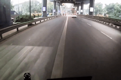 Tài xế hết hồn vì cả gia đình đi bộ băng qua đường ngay dốc cầu vượt