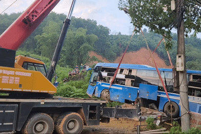 Lực lượng chức năng đã huy động cần cẩu cỡ lớn để đưa xe khách và nhiều ô tô, xe máy ra khỏi hiện trường vụ sạt lở tại xã Việt Vinh, huyện Bắc Quang, tỉnh Hà Giang.