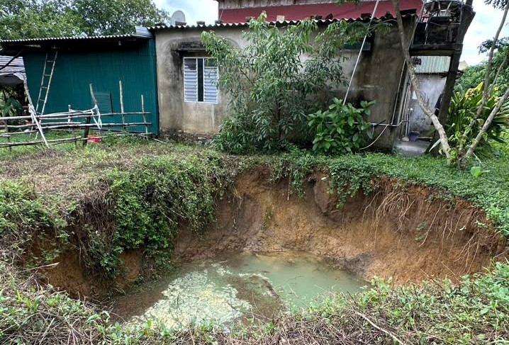 Sau khi từ nơi tránh trú bão trở về, gia đình ông Xá tá hoả khi phát hiện một hố sụt rộng hơn 2m, sâu khoảng 12m trong vườn nhà.