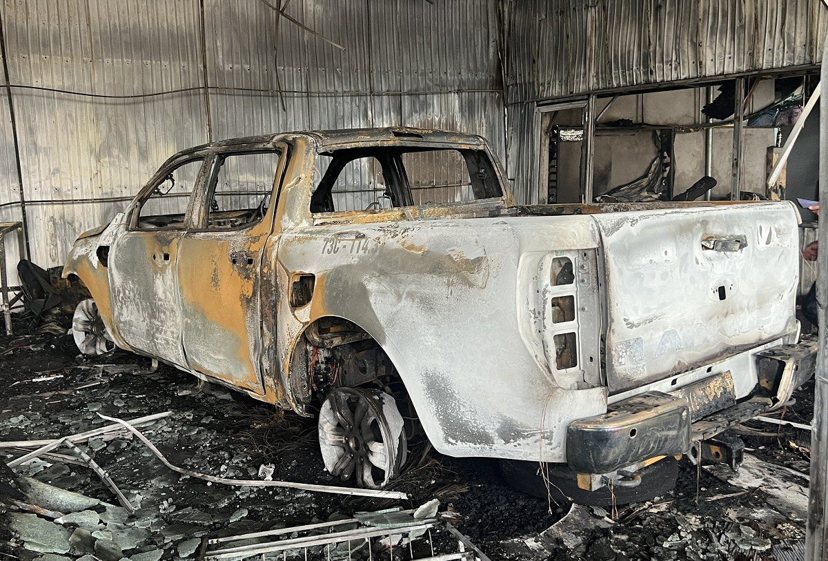 Ngọn lửa bốc lên từ phòng điều hành rồi lan ra xưởng nội thất ô tô khiến nhiều tài sản bị thiêu rụi. Trong đó, 1 xe bán tải bị cháy trơ khung sắt.