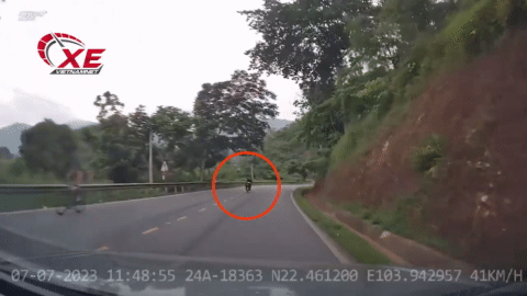 Dù đoạn đường hẹp và khuất tầm nhìn, nhưng hai người trên xe máy vẫn cố lấn làn để vượt chiếc xe tải cùng chiều, suýt chút nữa gây ra tai nạn nghiêm trọng.